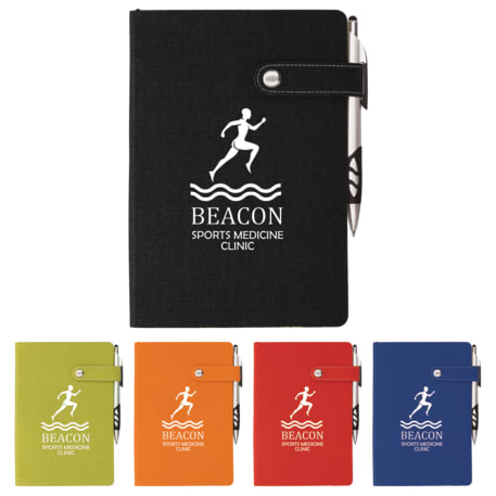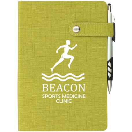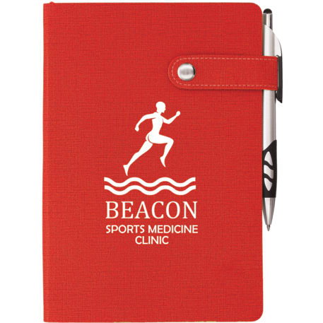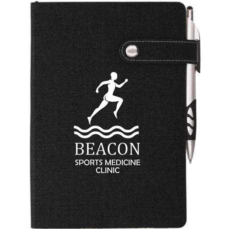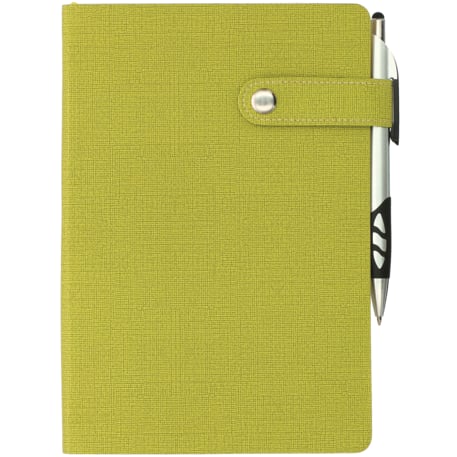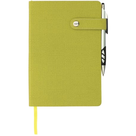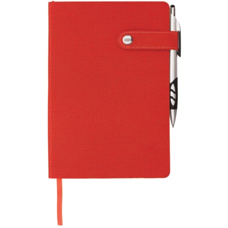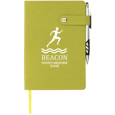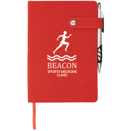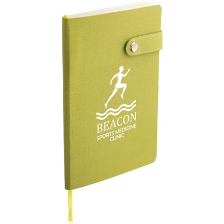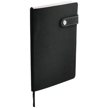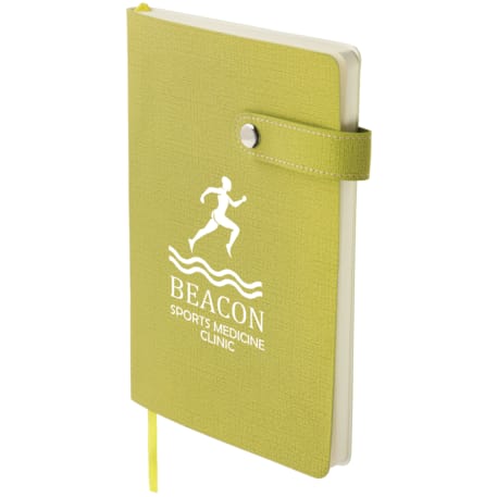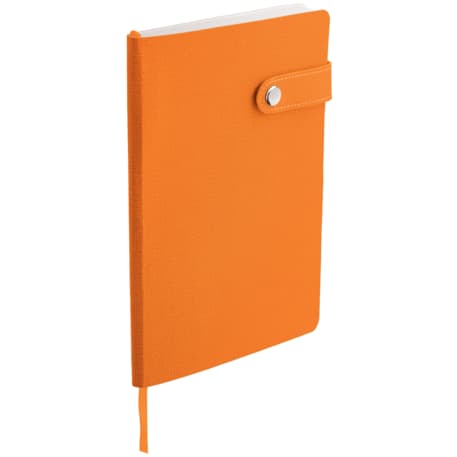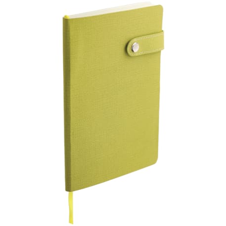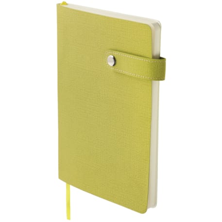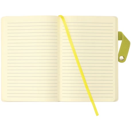 The 5.5" x 8" Paige Snap Closure Notebook is a smooth, PU cover bound notebook with 80 sheets of cream lined paper. Snap button closure. Color matching ribbon page marker.