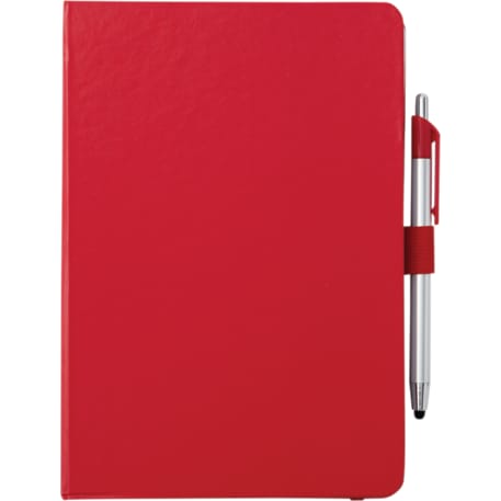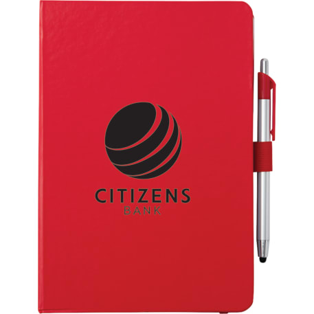 The 6" x 8.5" Crown Journal with Pen-Stylus features a hard cover, elastic closure, and a matching color ribbon bookmark. It also includes a plastic pen-stylus and 80 white ruled pages. A pen imprint is not available and pens are packed separately. Licensed under U.S. Pat. Nos. 8,847,930 and 9,092,077