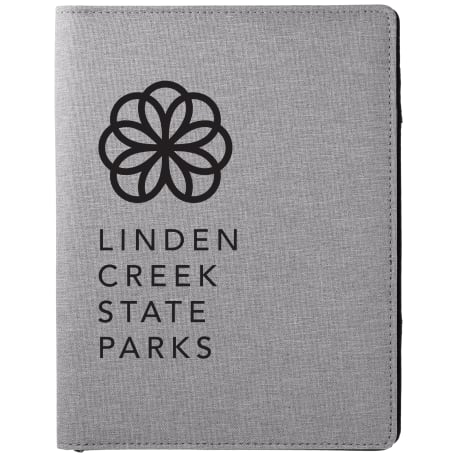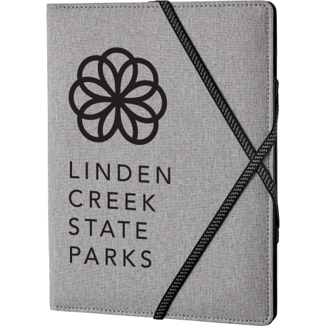 The Heathered Writing Pad features a fabric cover with interior organization for business cards, document pocket and pen loop. Exterior organization on back cover equipped with elastic strap closure. Writing pad has 20 sheets.