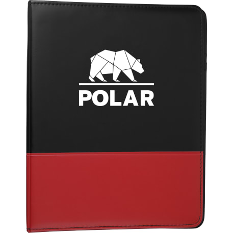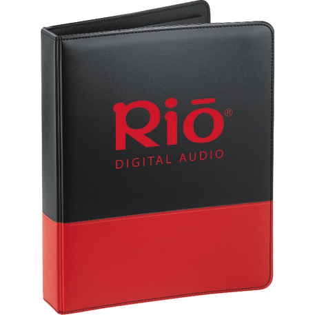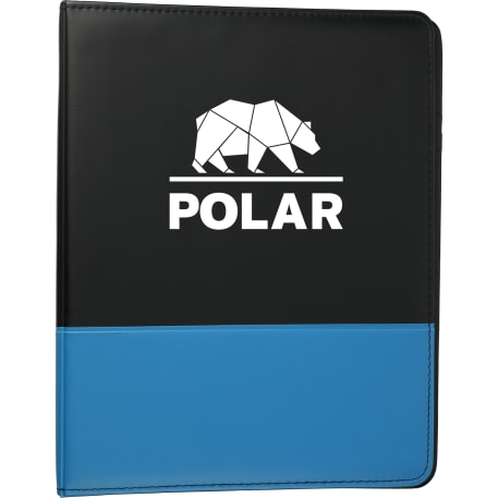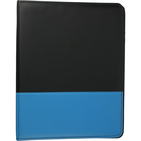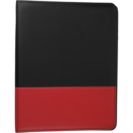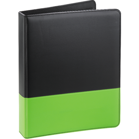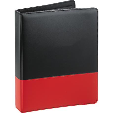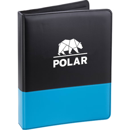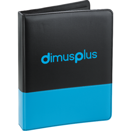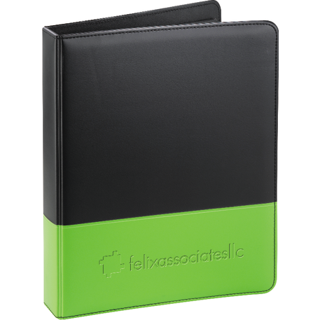 The Associate Ringbinder includes a 1” metal three-ring binder with a refillable lined 8.5” x 11.5” notepad. An inside front panel contains a flap pocket with 3 horizontal pockets and a 30 sheet ruled notepad and a pen loop.