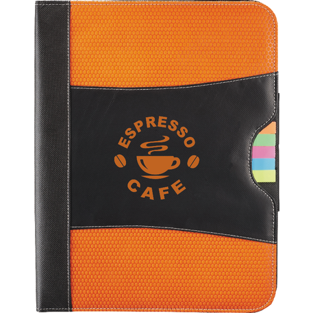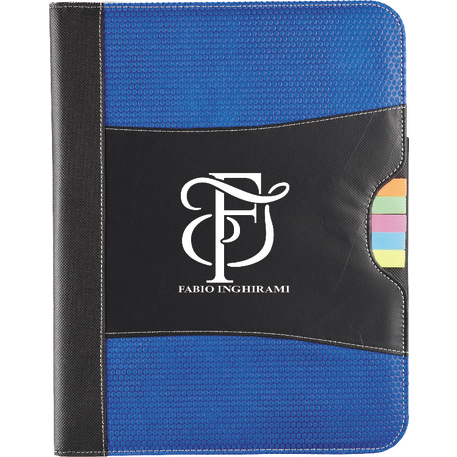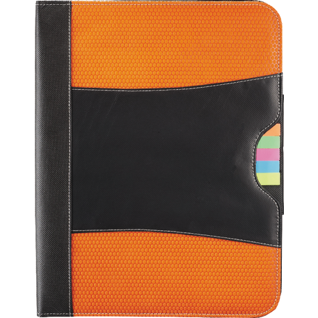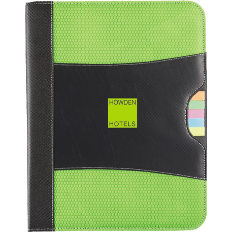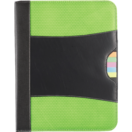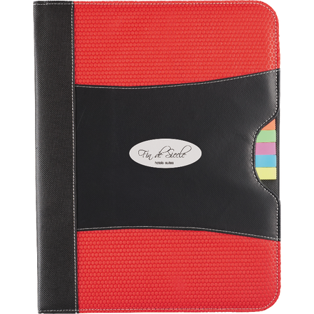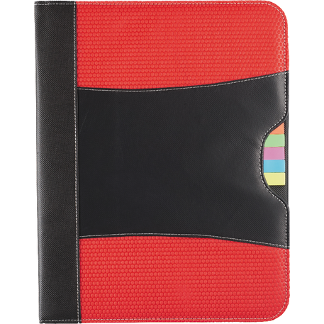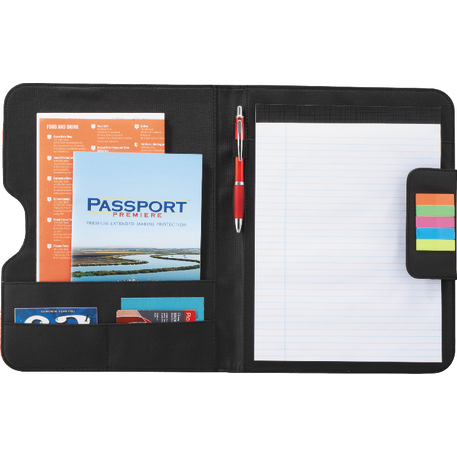 The Flare Organization Padfolio includes five assorted color sticky flags and an inside cover panel that contains two business card pockets, a document pocket and an elastic pen loop. It also features a refillable, 30 page ruled notepad. A pen is not included.