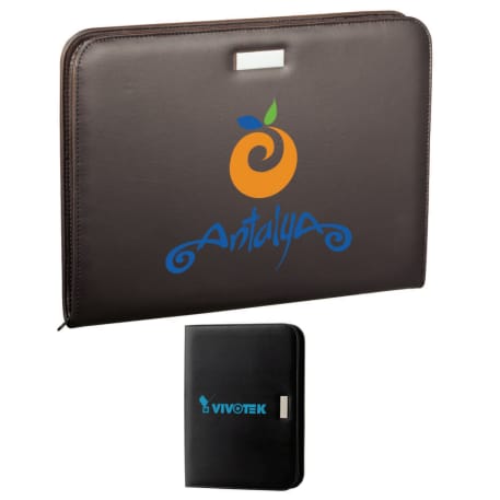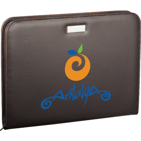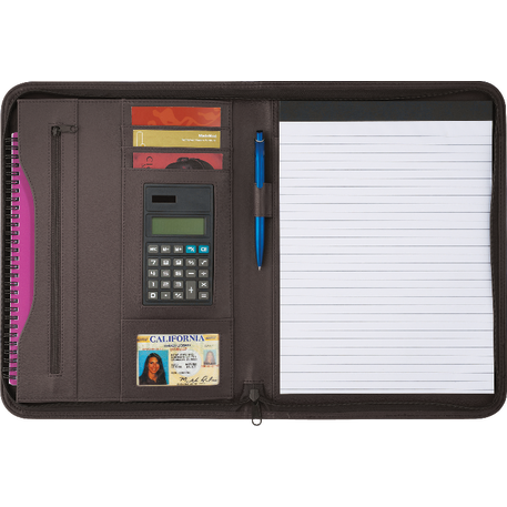 The New Yorker Padfolio feature a zippered cover and includes a solar calculator and a refillable, 30 ruled page 8.5” x 11.5” notepad. It also features an inside document pocket, a zippered pocket, card pockets and a clear ID window pocket and pen loop. A pen is not included.
