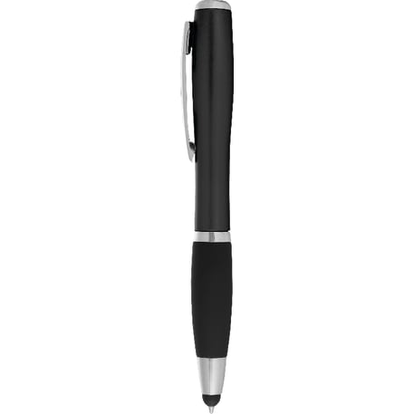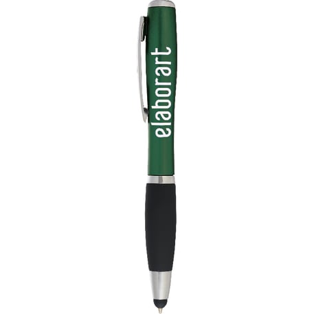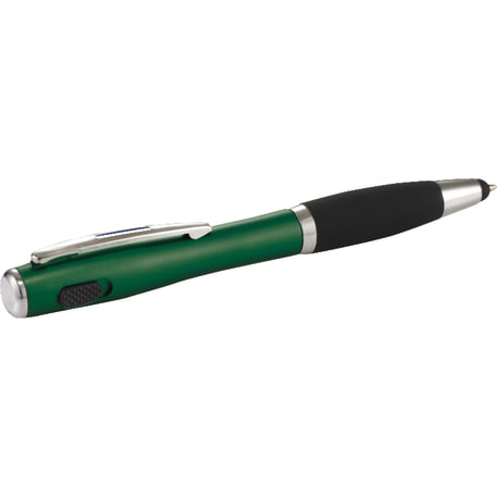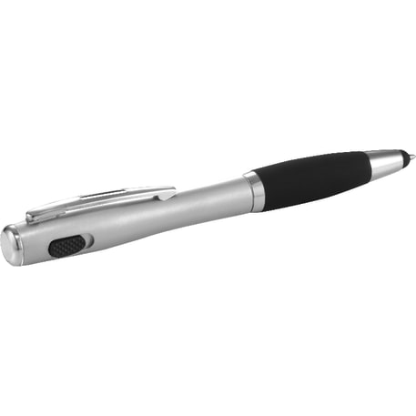 The Nash Matte Finish Ballpoint Pen-Stylus with Light features a twist-action ballpoint pen with soft rubber stylus for touchscreen devices. Single white LED located at the end of the barrel. Use slide button to turn light on and off. Licensed under U.S. Pat. Nos. 8,847,930 and 9,092,077