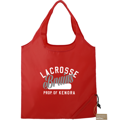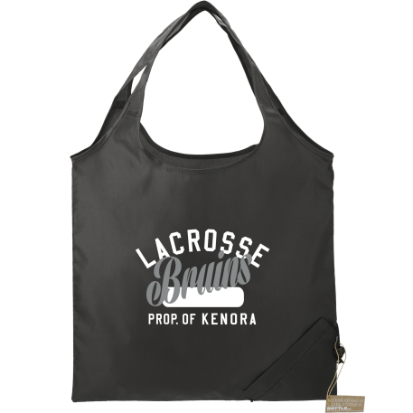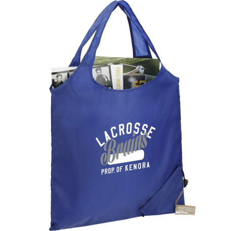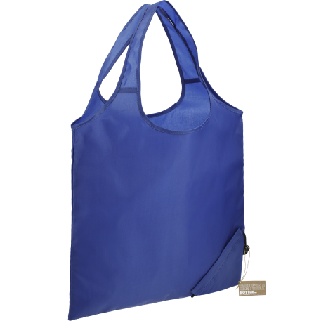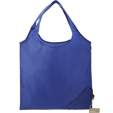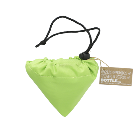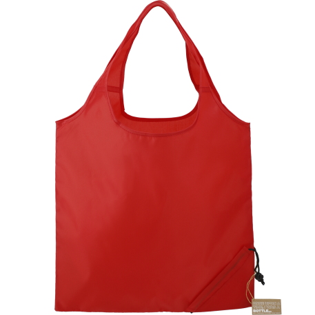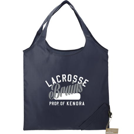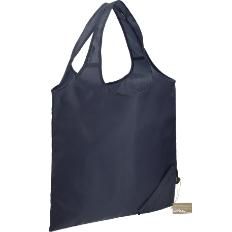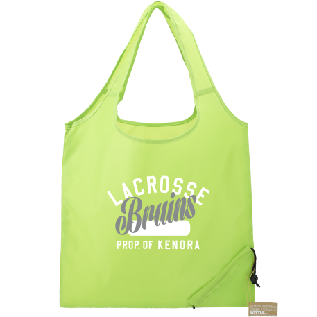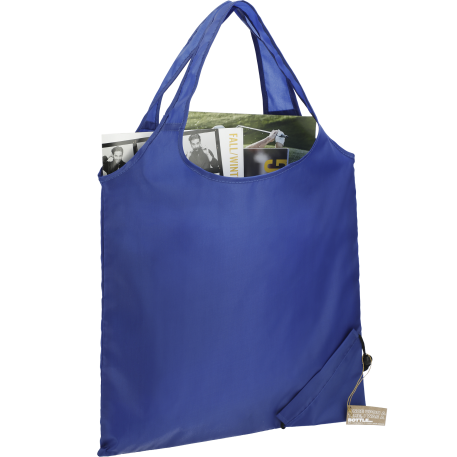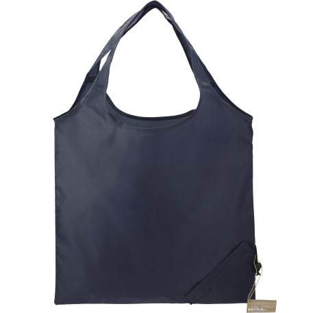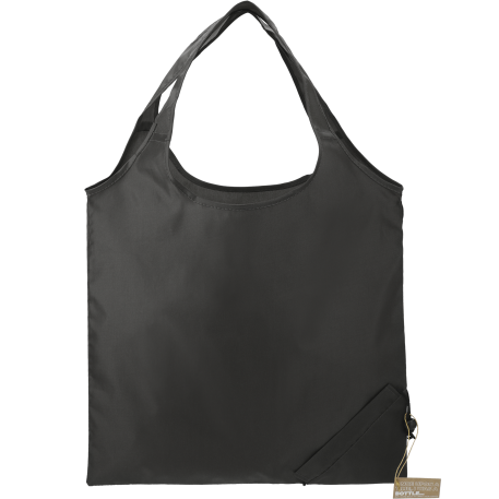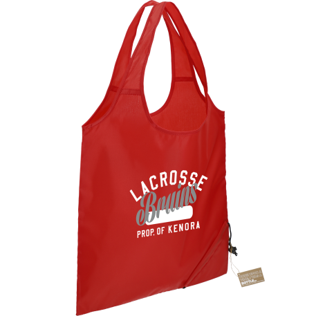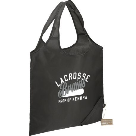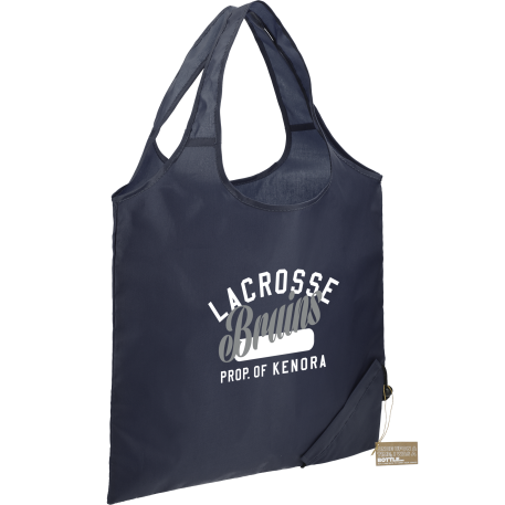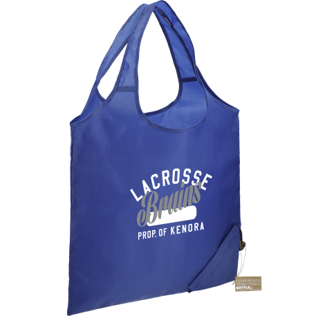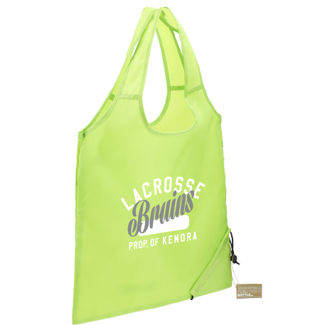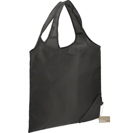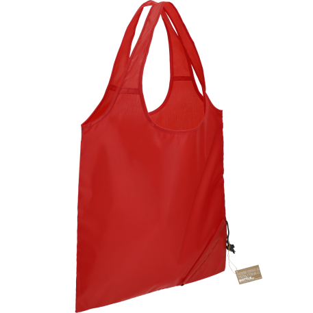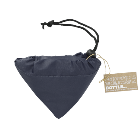 The Bungalow RPET Foldaway Shopper Tote has an open main compartment with double handles and a unique fold-away function that gathers into a corner with drawstring closure. This tote is made from 100% recycled 210d polyester made from water bottles and the material is easily wipeable to protect against germs. Through a partnership with 1% For The Planet one percent of sales of this and all EcoSmart products will be donated to nonprofits dedicated to protecting the planet.