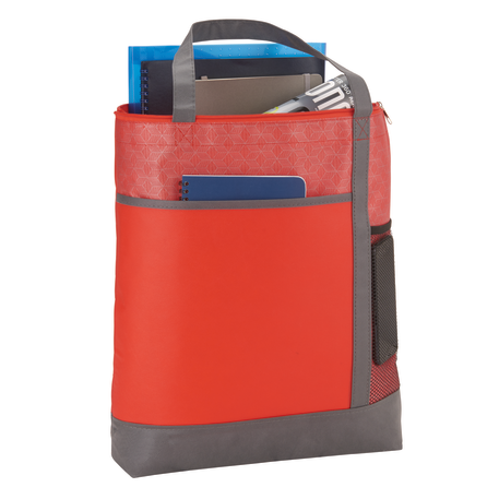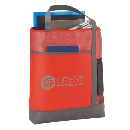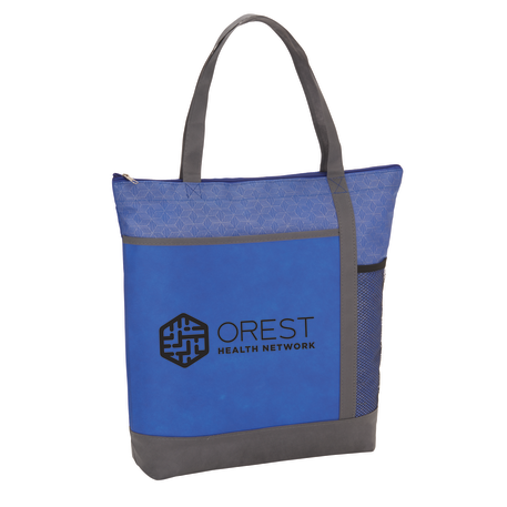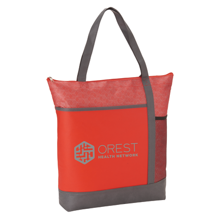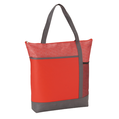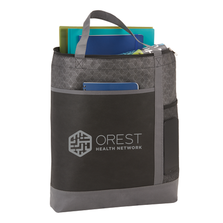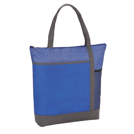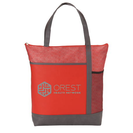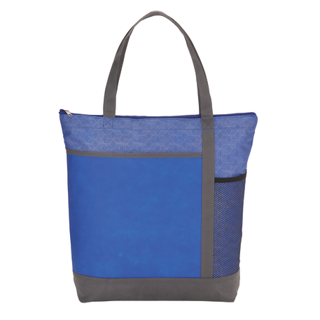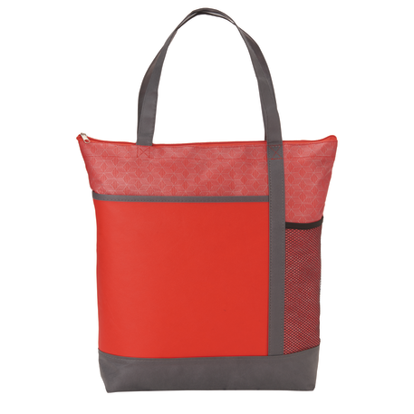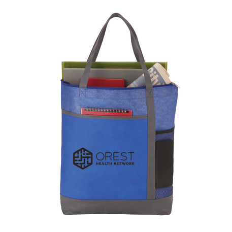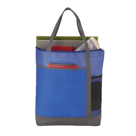 The Chrome Non-Woven Zippered Convention Tote features a mesh side accent pocket and zippered main compartment.