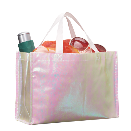The Iridescent Non-Woven Shopper Tote makes a trendy shopping companion. This tote features an open main compartment.