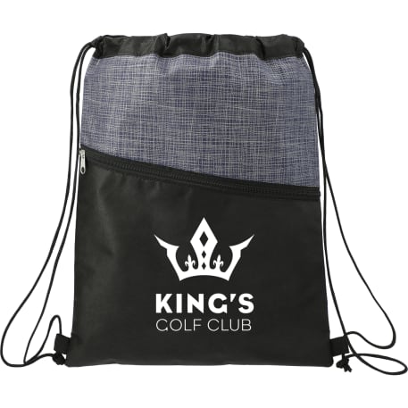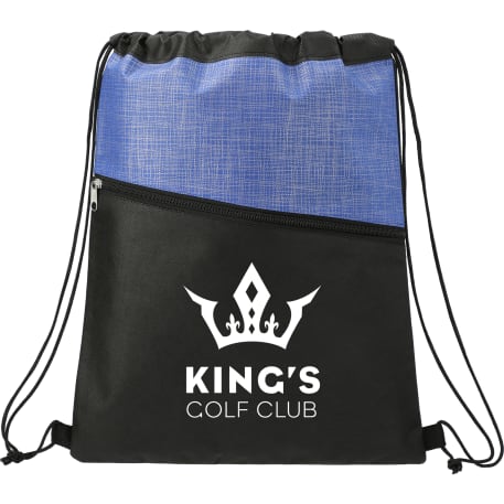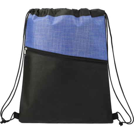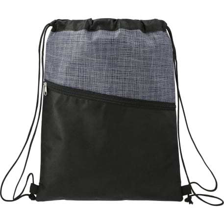 The Cross Weave Zippered Drawstring Bag features a cinch closure, zippered front pocket, and a trendy, metallic cross weave pattern.