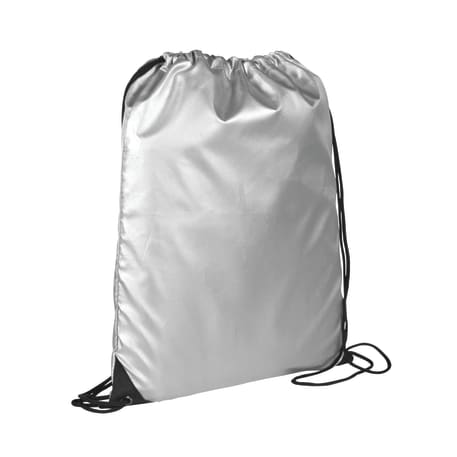 The Oriole Reflective Drawstring Bag includes an open main compartment with a cinching rope closure and reinforced bottom corner tabs. This reflective bag is kid-friendly.