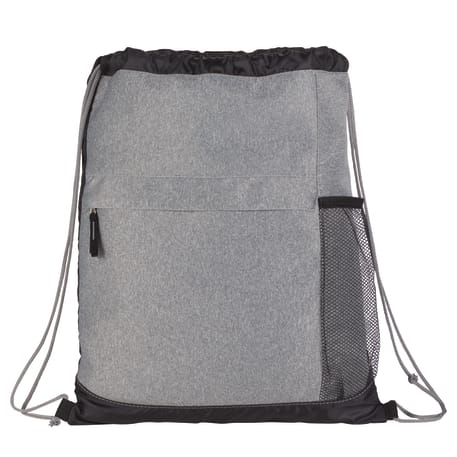 The Heather Mélange Drawstring Bag features a large open main compartment with a cinch closure as well as a front zippered pocket. This kid-friendly bag also has a side mesh water bottle pocket.