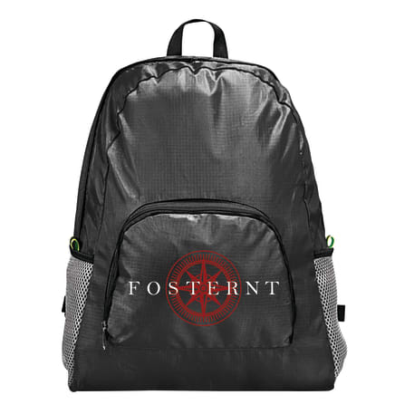 The Packable Backpack is a super light, durable, and compact backpack. Unfolded, it features two side mesh pockets, a large zippered main compartment and a front zippered pocket. When folded, it closes into a small pouch designed for easy carrying and storing.