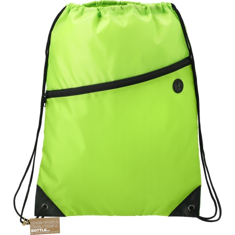 The Robin RPET Drawstring Bag has a large main compartment with a cinching rope closure. The zippered front pocket also features an earbud port and reinforced corner tabs. This bag is manufactured from 100% recycled 210d polyester, made from water bottles. Through a partnership with 1% For The Planet one percent of sales of this and all EcoSmart products will be donated to nonprofits dedicated to protecting the planet.