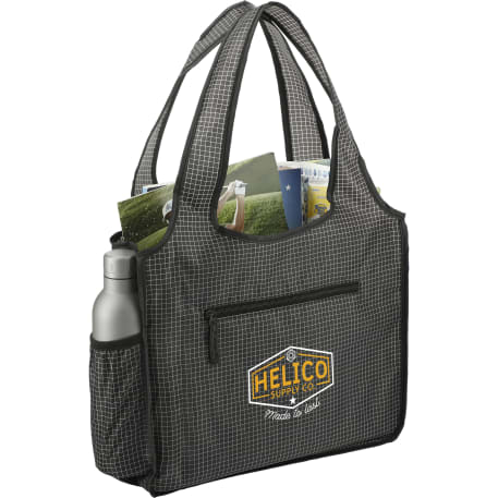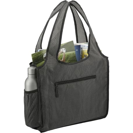 The Grid Bungalow Tote features an open main compartment and a slash front pocket.