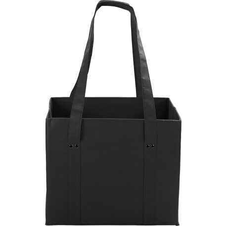 100g non-woven material with supportive board re-enforced on all sides including sewn in bottom board. This tote can completely collapse flat for easy storage when not in use. 12.5'' grab handles. Perfect for long-lasting use as a grocery tote or storage bin. This tote was previously Leed's 2150-65, Collapsible Cube Storage Tote.