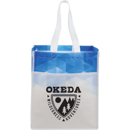 The Gradient Laminated Grocery Tote is modern, sleek and on trend. This custom tote bag features an open main compartment and a large front slash pocket. The Gradient Laminated Grocery Tote includes webbing 10"" drop height handles. This tote was previously Leed's 2150-69, Gradient Laminated Grocery Tote.