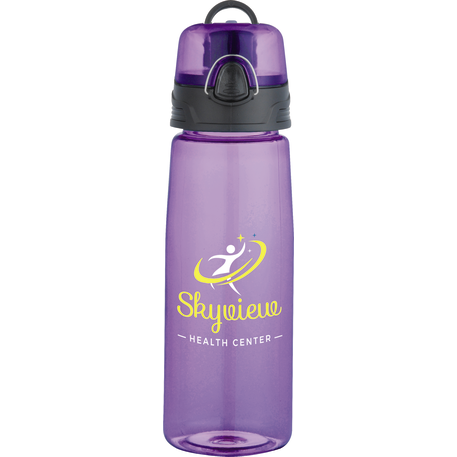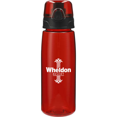 The Capri 25oz Tritan™ Sports Bottle features single-wall construction and a press-button, flip-open drinking lid with a spout. It also includes a metal locking latch and a plastic carry loop. Hand wash only and follow any included care guidelines.
