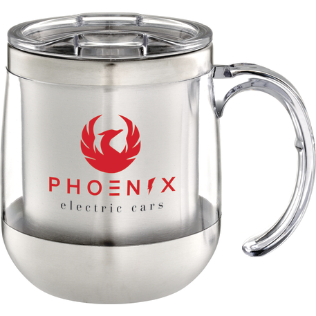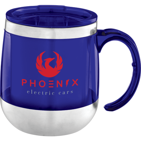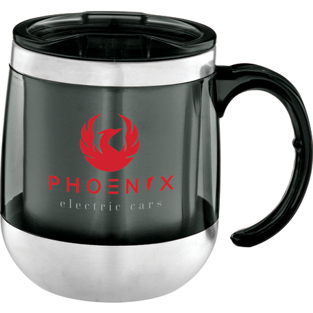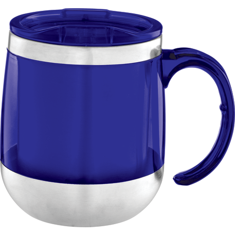The Brew 14oz Desk Mug is made from double-wall construction with a stainless steel liner and a plastic push-on lid with a slide-lock drink opening. Hand wash only and follow any included care guidelines.