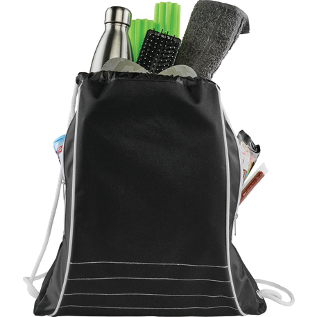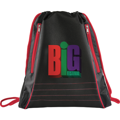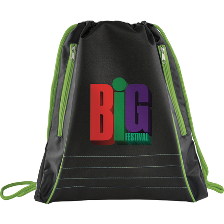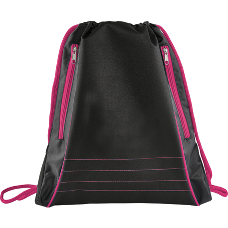 The Neon Deluxe Drawstring Bag features color pop accents, stitching and piping throughout and an open main compartment with a cinching closure and two easy access zippered pockets on the front.