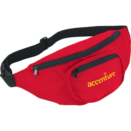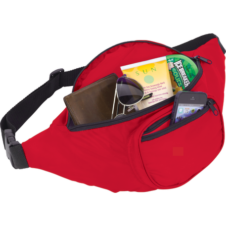 The Hipster Deluxe Fanny Pack lets you be cool on the go with its zippered main compartment, zippered front pocket and a hidden zippered pocket in the back. It also comes with an adjustable waist strap and buckle for a perfect fit. The strap expands to about 47 inches.
