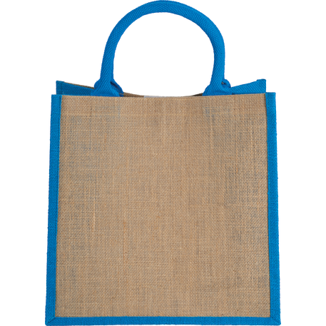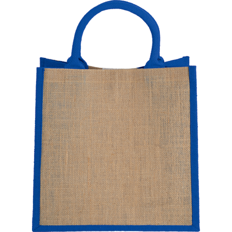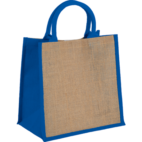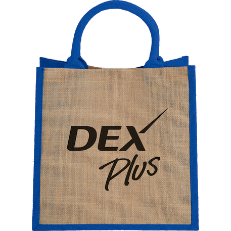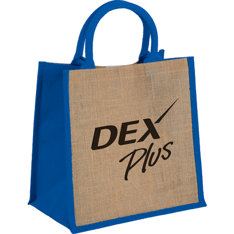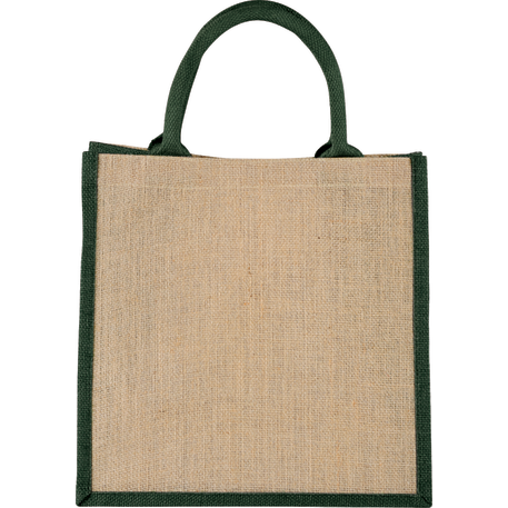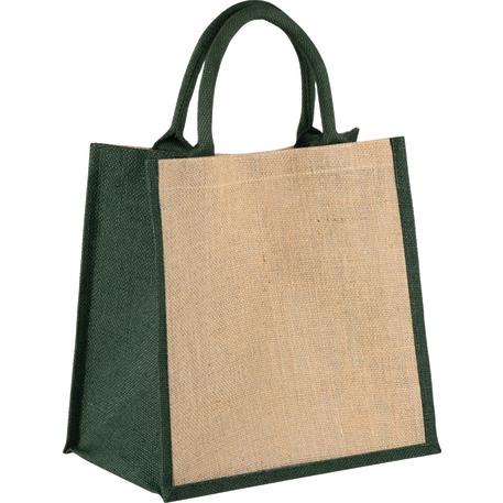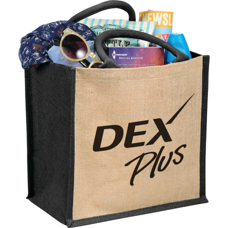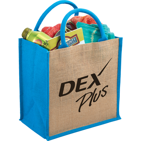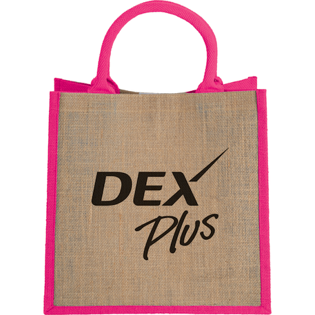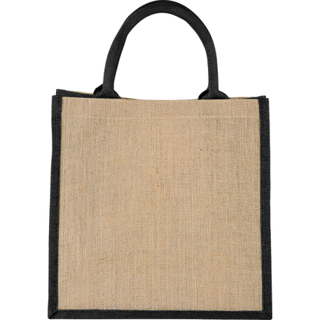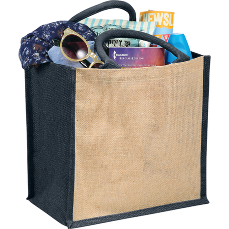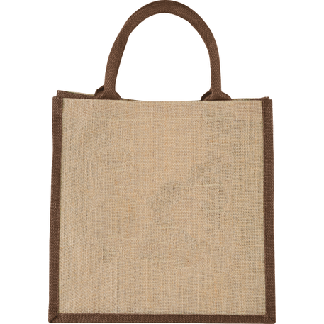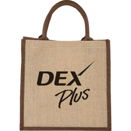 The Medium Jute Gift Tote features an open main compartment with a hook and loop closure and double 14" handles. Disclaimer: Minimum of 32pt. font size. Bold artwork only. No fine graphics or text.