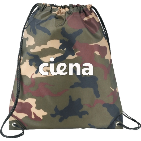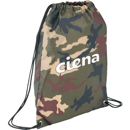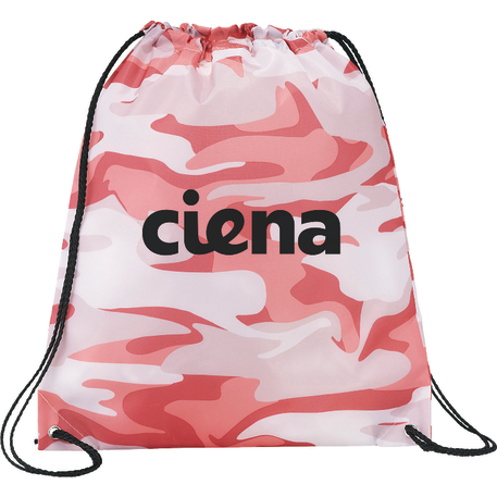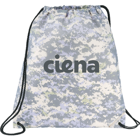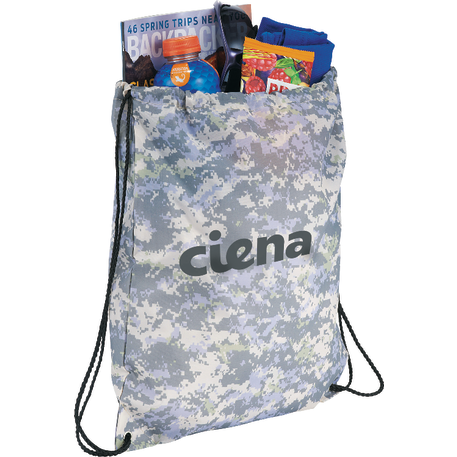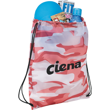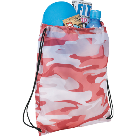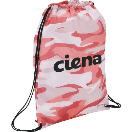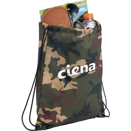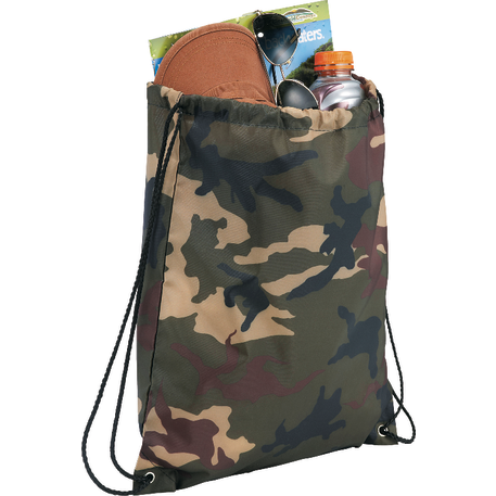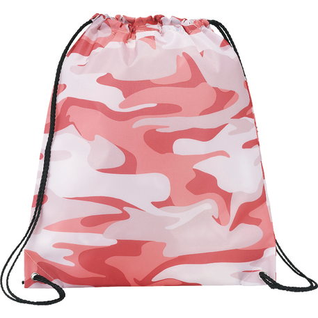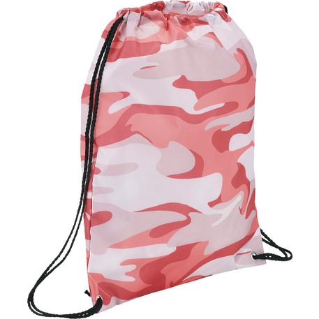 The Camo Oriole Drawstring Bag features an open main compartment that features different color camo prints and reinforced bottom corner tabs. The cinching rope closure keeps contents secure while carrying.