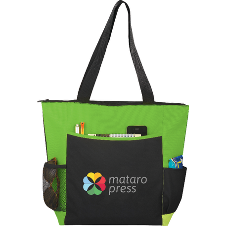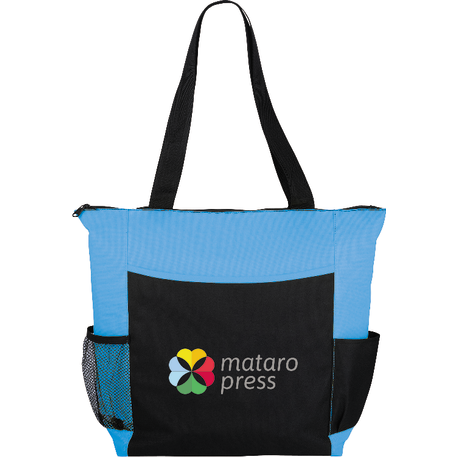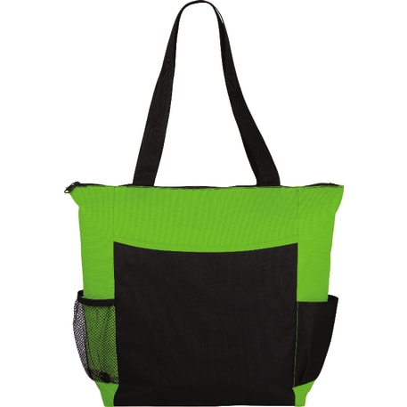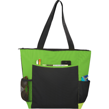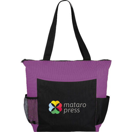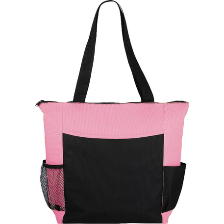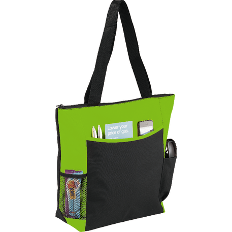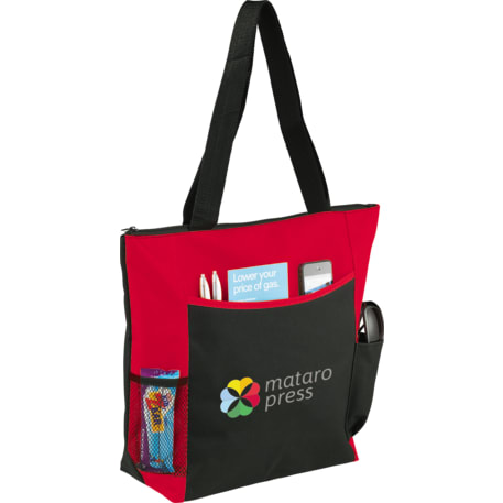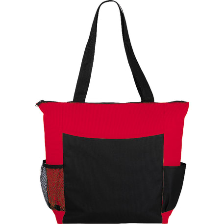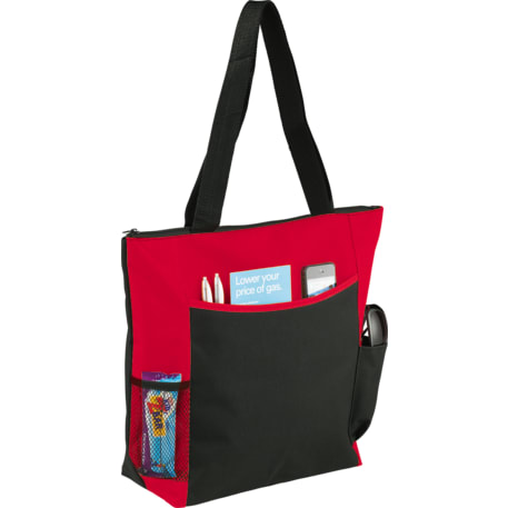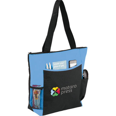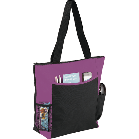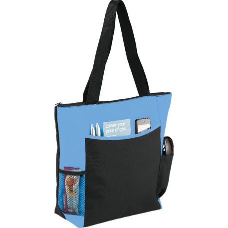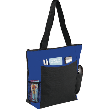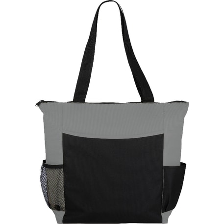 The Grandview Zippered Convention Tote has a large zippered main compartment with double 25 inch handles. This tote features an open front pocket, a side mesh pocket and a regular side pocket.