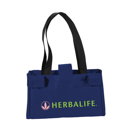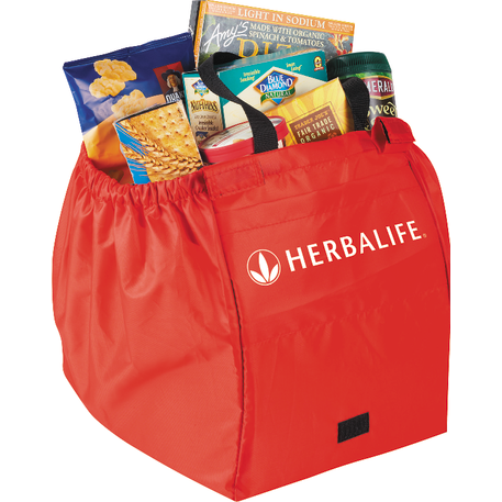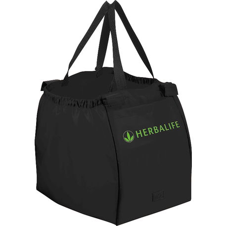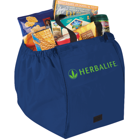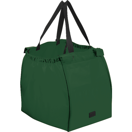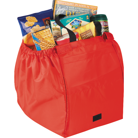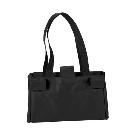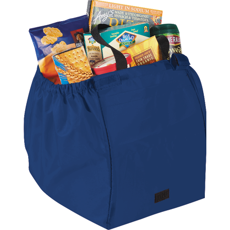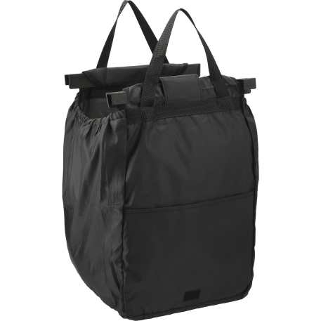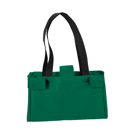 NEW for 2021, the Over-the-Cart grocery tote features durable plastic side bars and an elastic top that stretches to fit over most grocery carts and help keep you protected from germs. Easily wipeable 210d Nylon material to help maintain cleanliness. Open slash front pocket to hold coupons or personal belongings and durable carry handles for easy removal from the cart. Features a Velcro top flap to fold up the tote for easy storage when not in use.