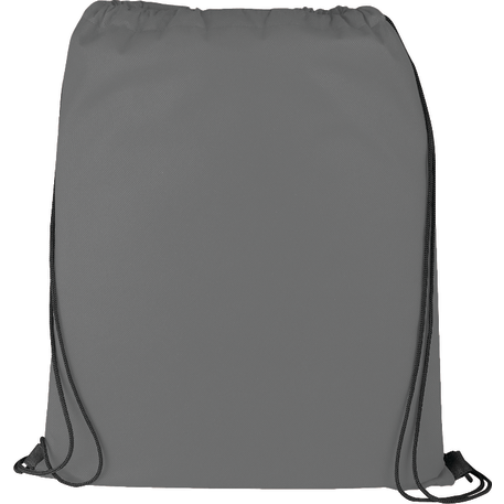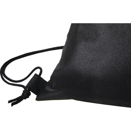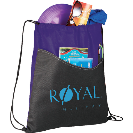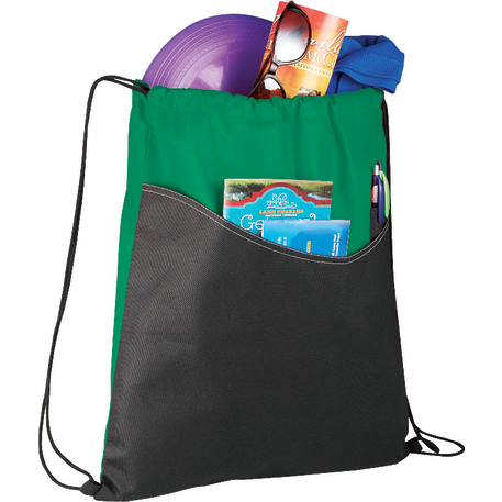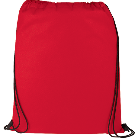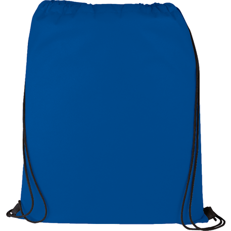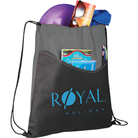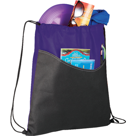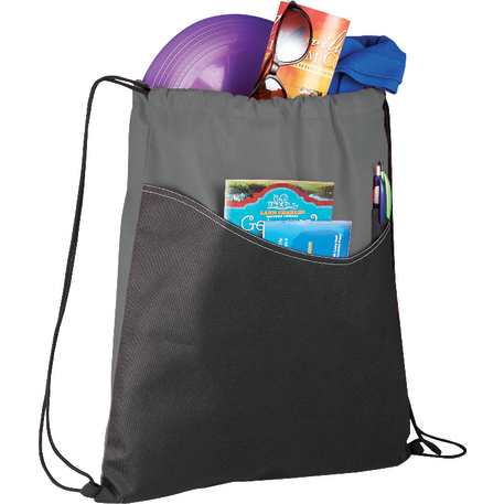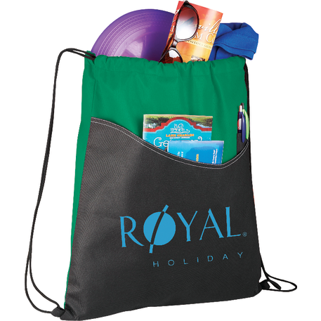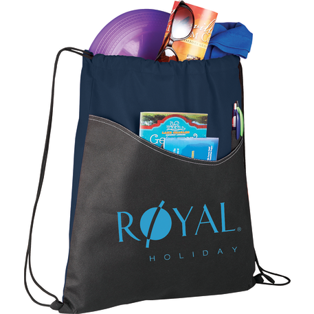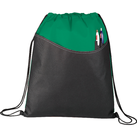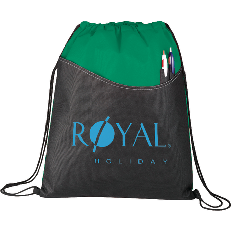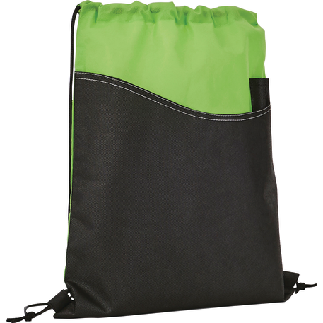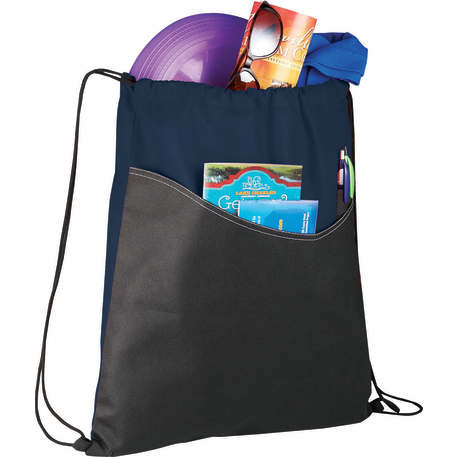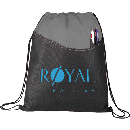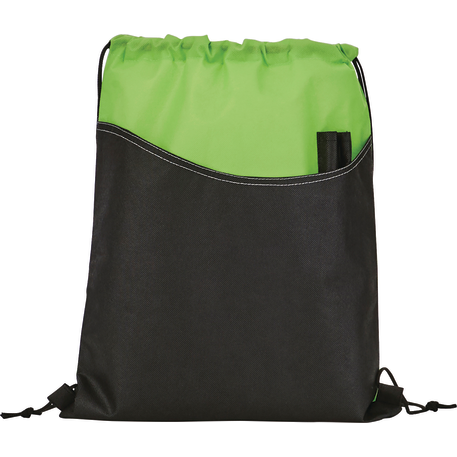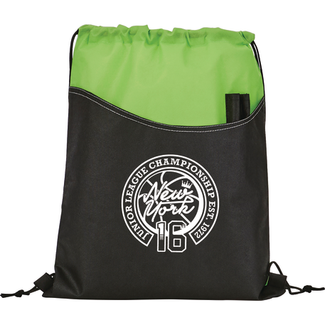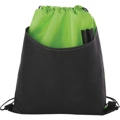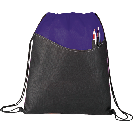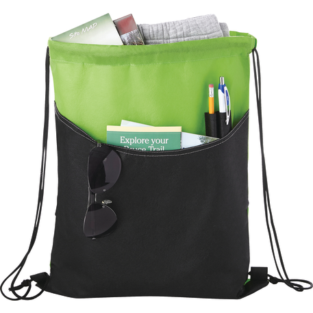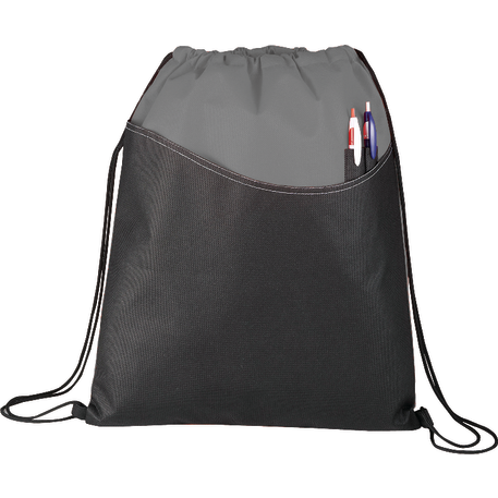 The Rivers Non-Woven Drawstring Bag has an open main compartment with an open front pocket with double pen sleeves and a cinching rope closure.