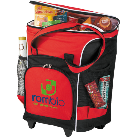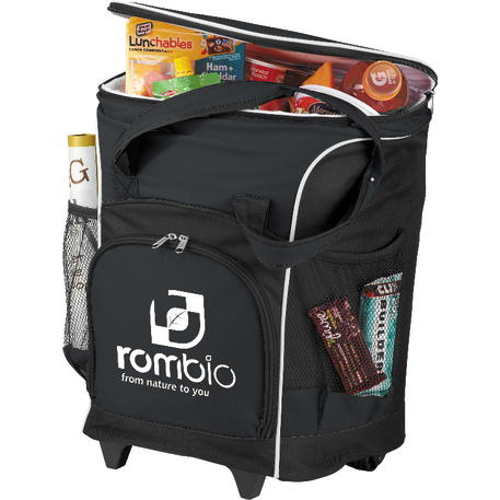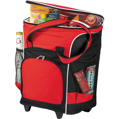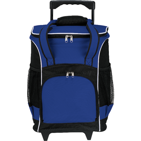 The Rooney 48-Can Rolling Event Cooler comes with PEVA insulation, a large zippered main compartment, a zippered front pocket, two side mesh pockets for extra storage and a retractable telescoping handle that extends 21". Also features inline skate wheels, a bottom board and double carry handles with a hook and loop wrap. It's great for sporting and outdoor events. With Trolley - 18" H x 12.5" W x 12" D