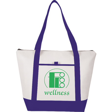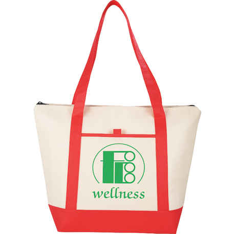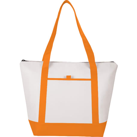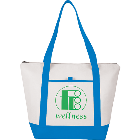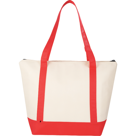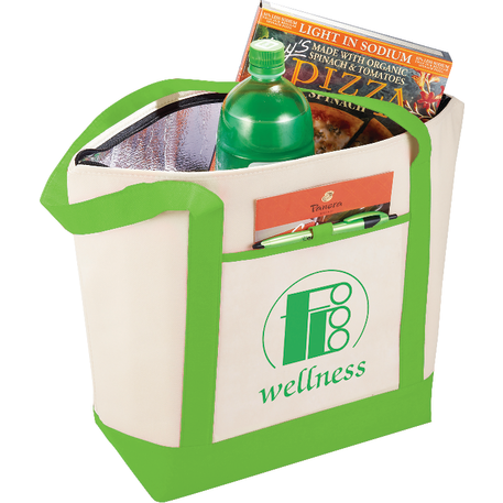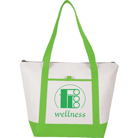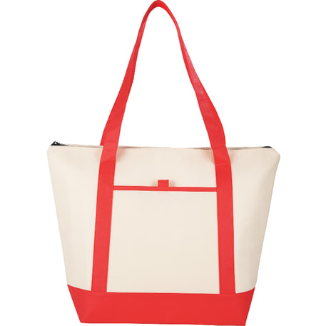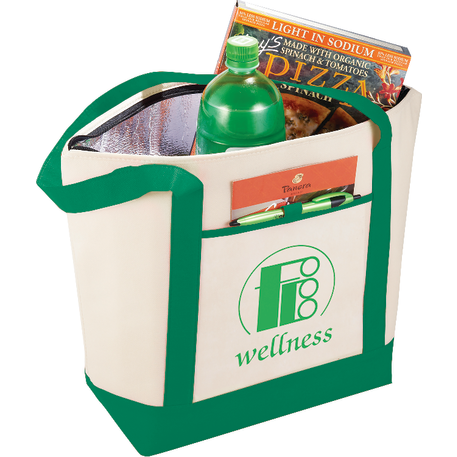 The Lighthouse 24-Can Non-Woven Boat Tote Cooler has a Zippered main compartment with double 24" handles. Open front pocket with pen loop. Foil lining.