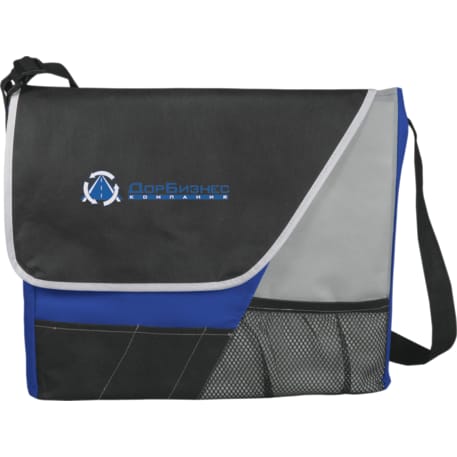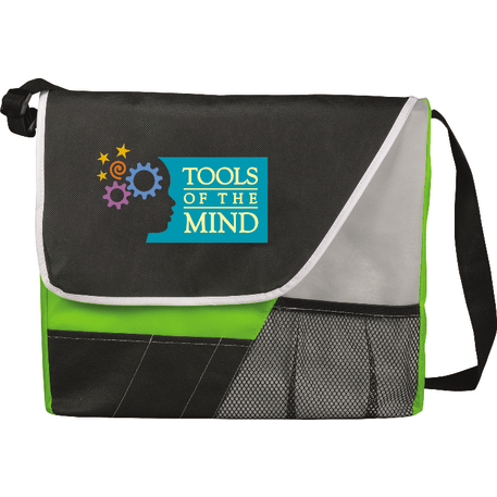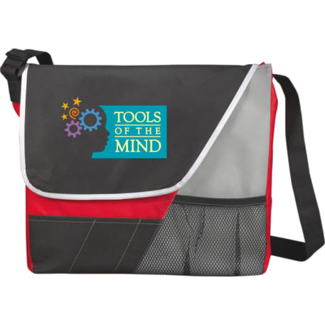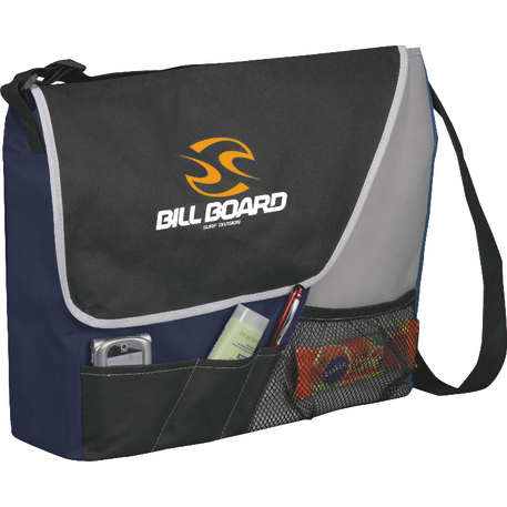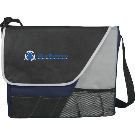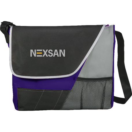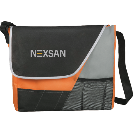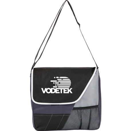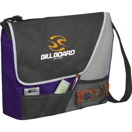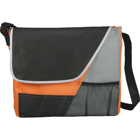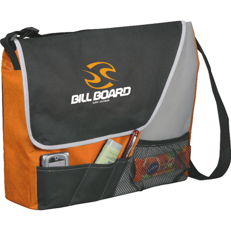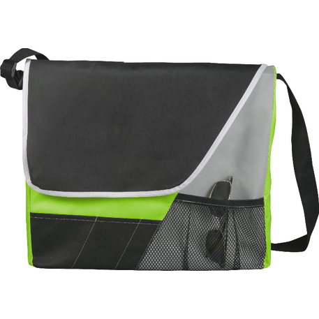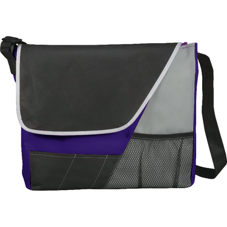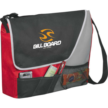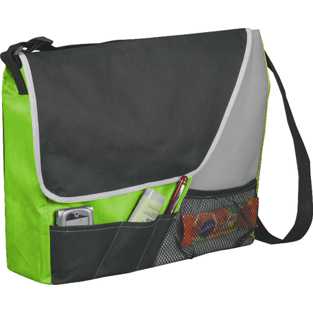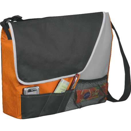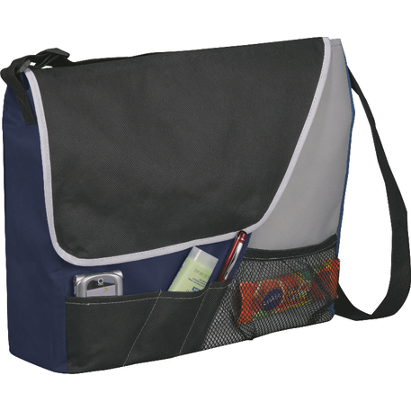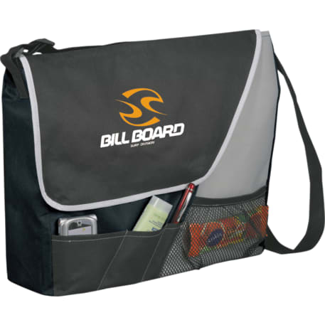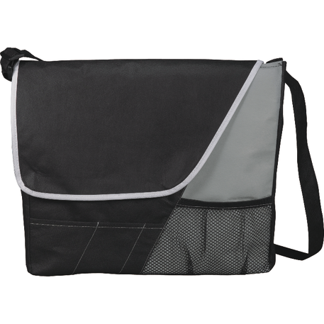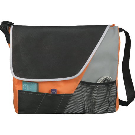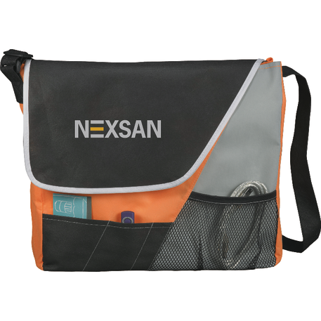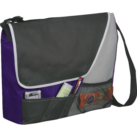 The Rhythm Non-Woven Messenger Bag has an open main compartment with a hook and loop flap closure. It also includes convenient front accessory pockets, a front mesh pocket and adjustable shoulder strap.