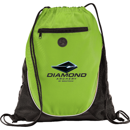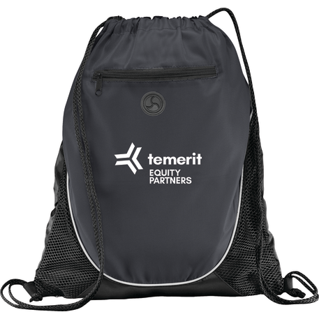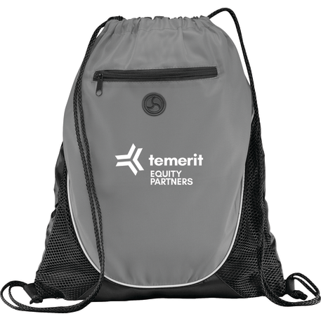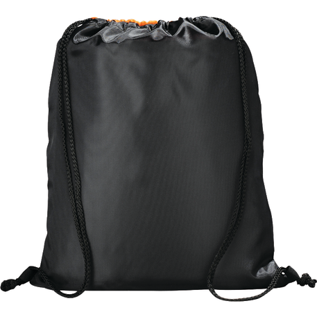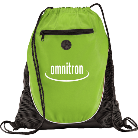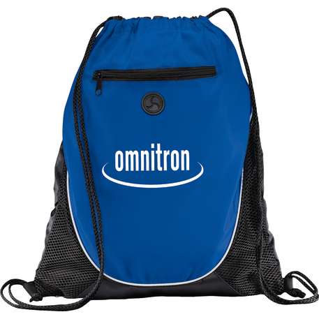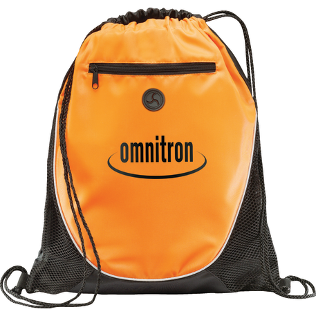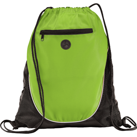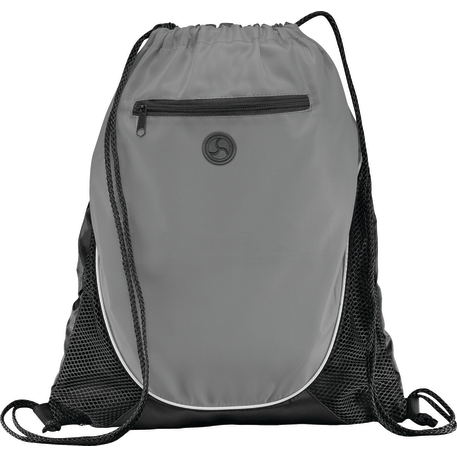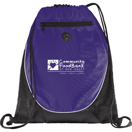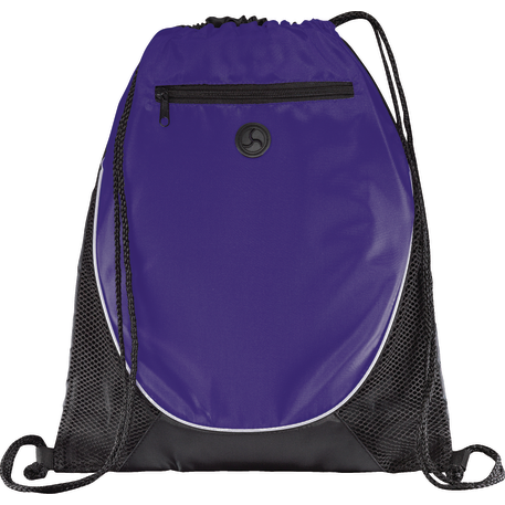 The Peek Drawstring Bag has an open main compartment with cinching rope closure. The zippered front pocket also features a handy earbud port.