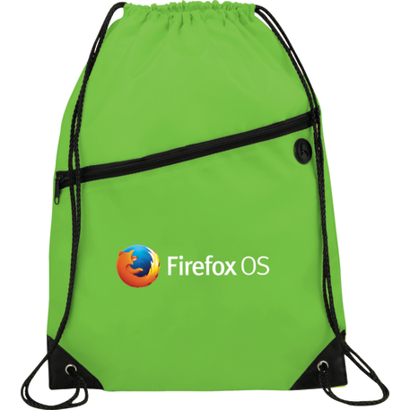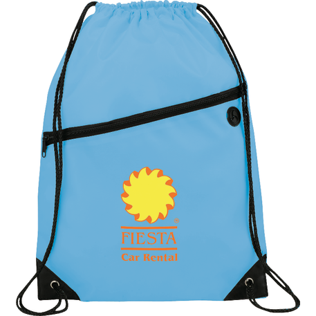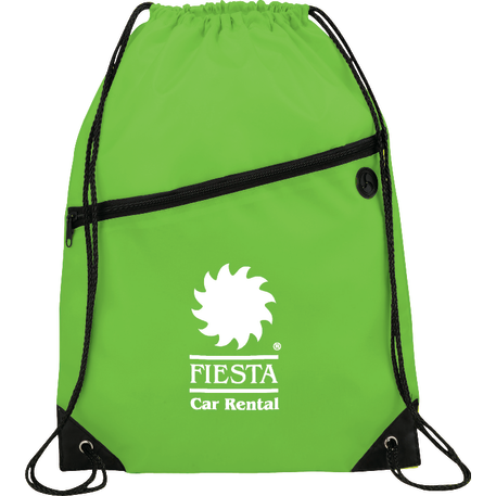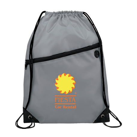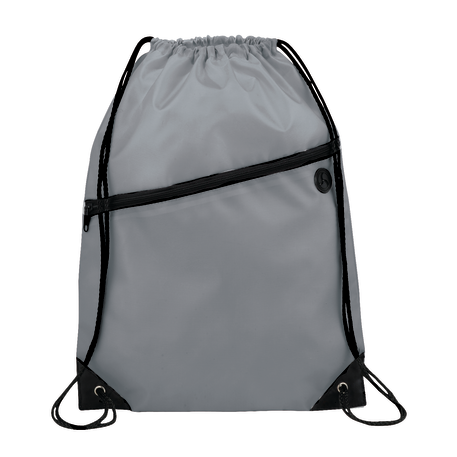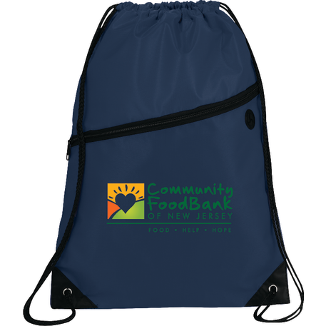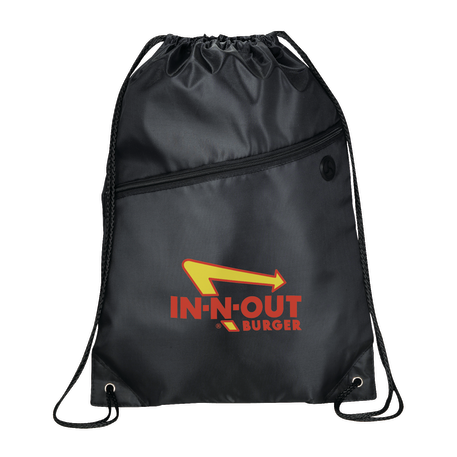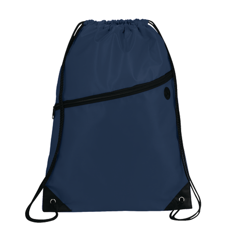 The Robin Drawstring Bag has a large main compartment with a cinching rope closure. The zippered front pocket also features an earbud port and reinforced corner tabs.
