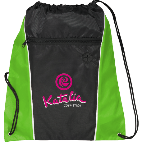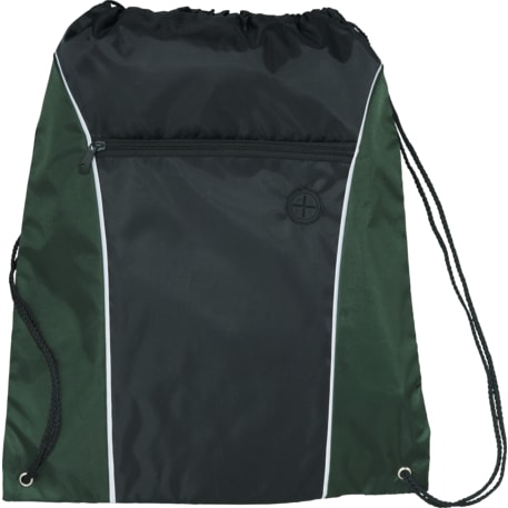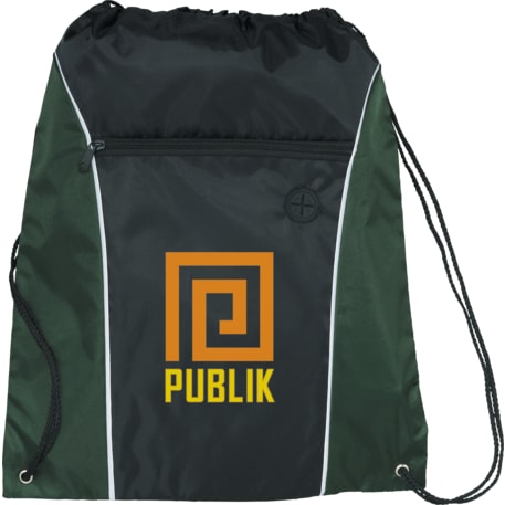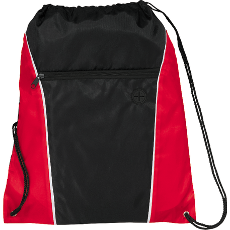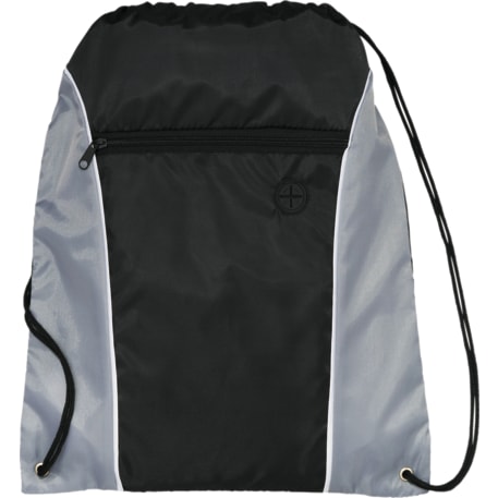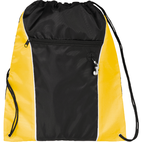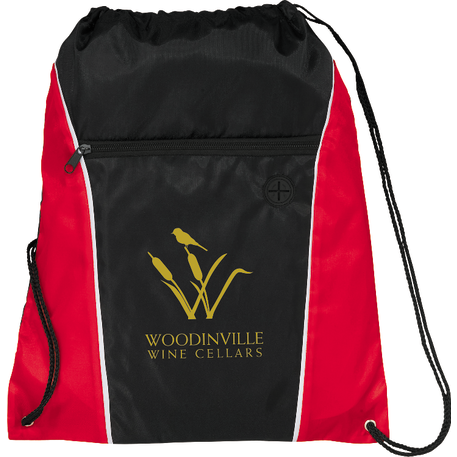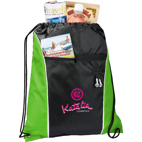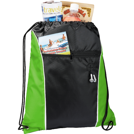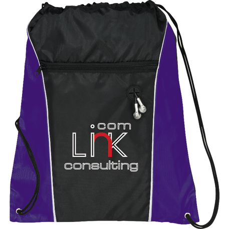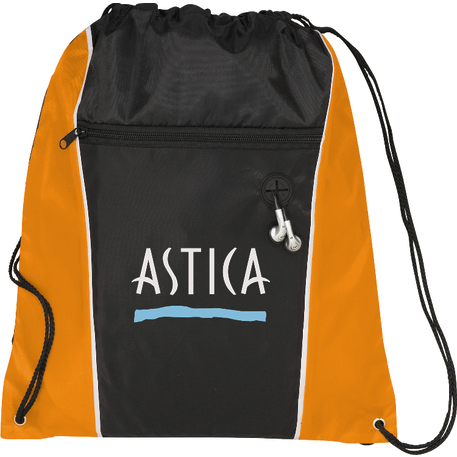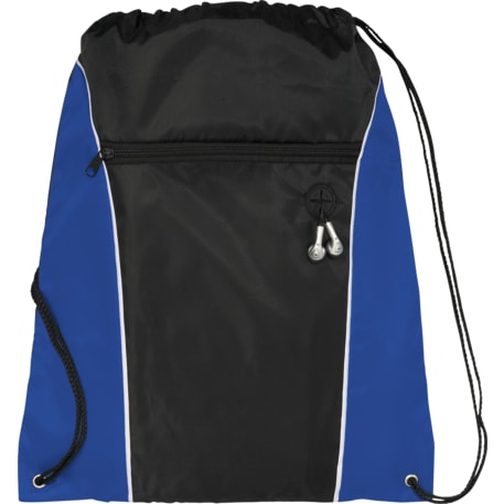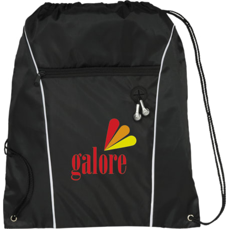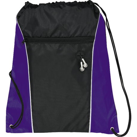 The Funnel Drawstring Bag features an open main compartment with a cinching rope closure. The zippered front pocket even includes an earbud port.