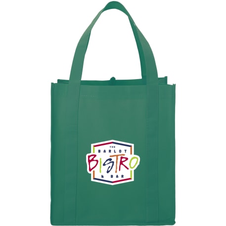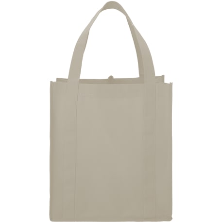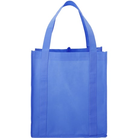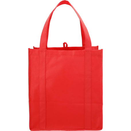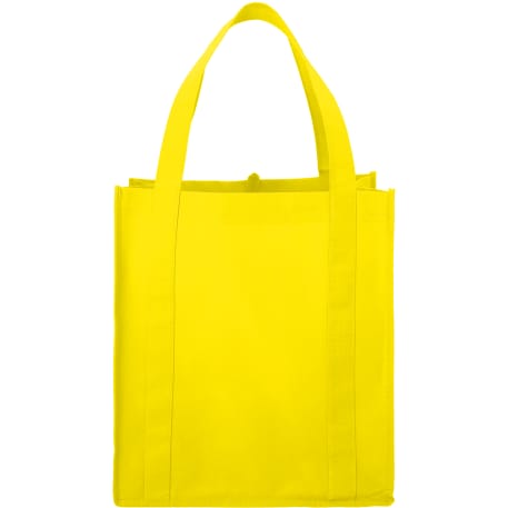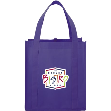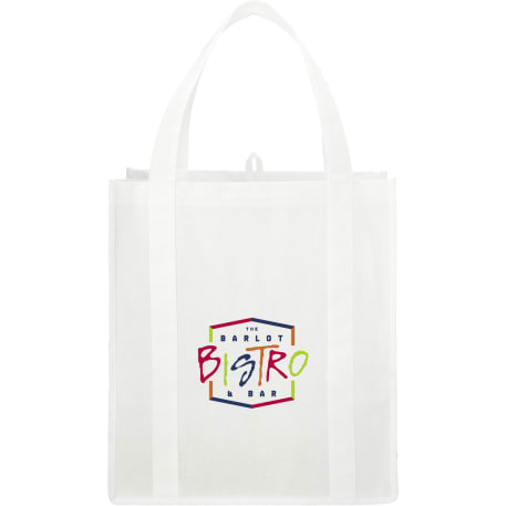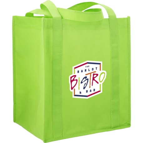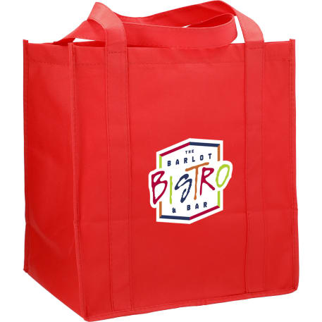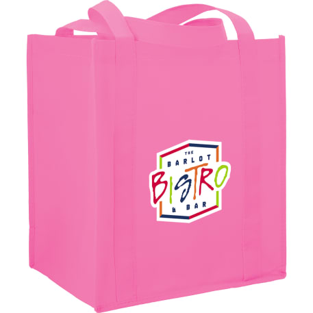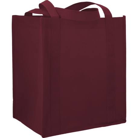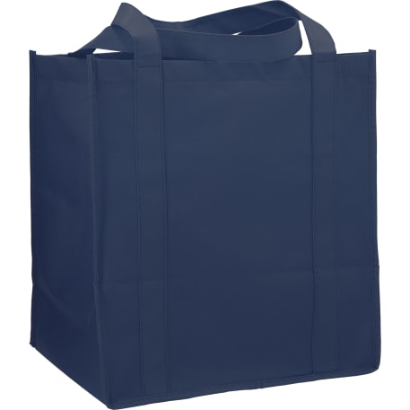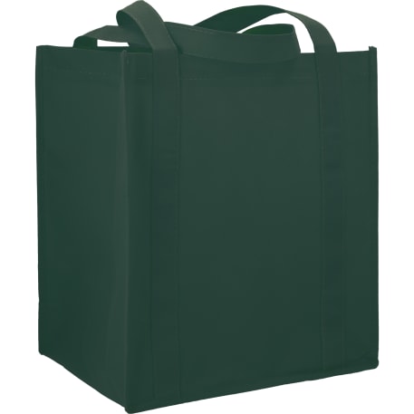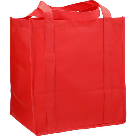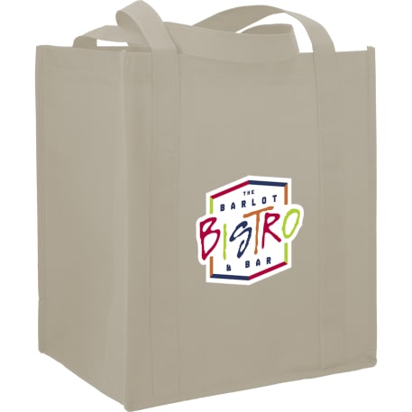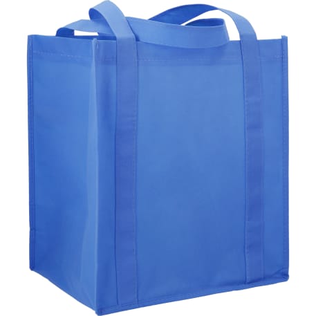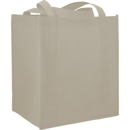 With its reusable design, the Hercules Non-Woven Grocery Tote offers a sustainable alternative to plastic grocery bags. It has lightweight polypropylene construction, features 18.5" reinforced handles, and contains a supportive bottom board for added durability. Its spacious open main compartment is ideal for carrying groceries or personal items, such as books, clothing, and electronics. This tote is the same as Leed's item 2150-38, Big Grocery Non-Woven Tote.