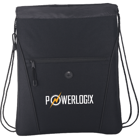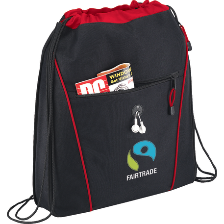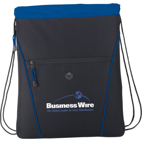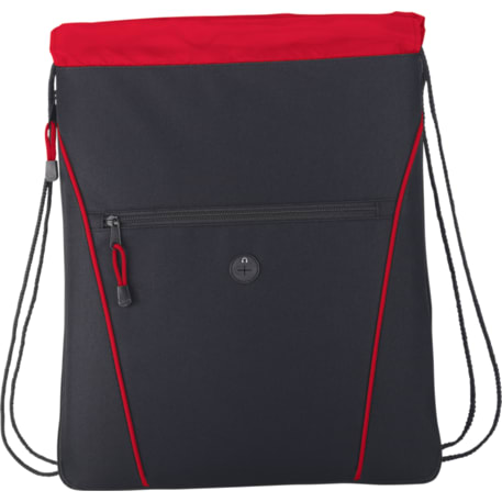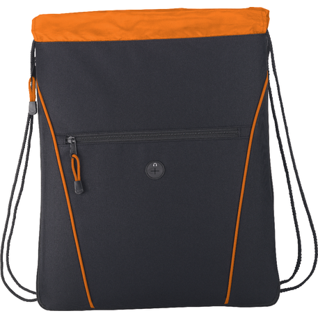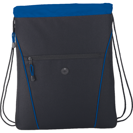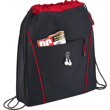 The Raven Drawstring Bag has an open main compartment with a cinching rope closure. It also features a zippered expandable gusset and a zippered front pocket with a convenient earbud port.