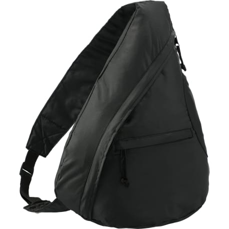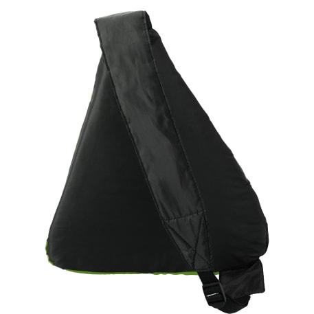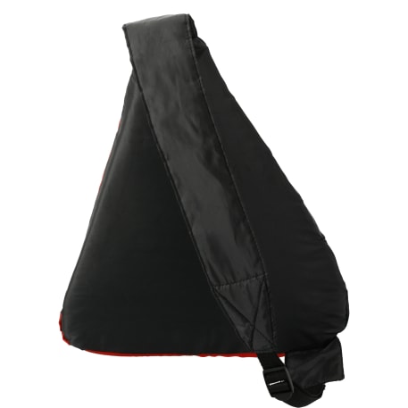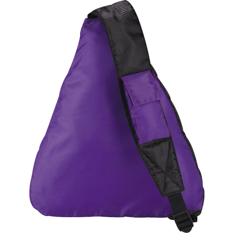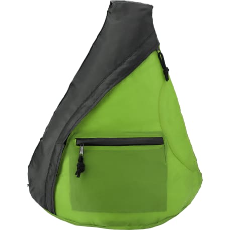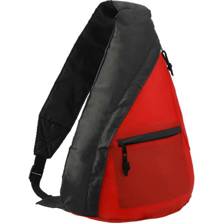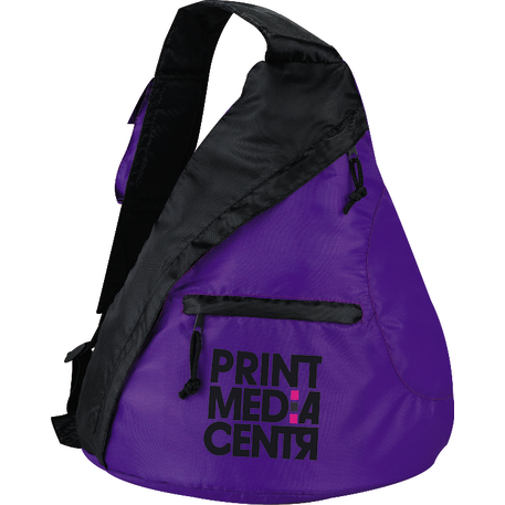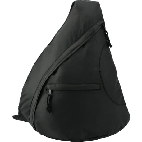 The Downtown Sling Backpack features a zippered main compartment, zippered front pocket and an adjustable sling strap.