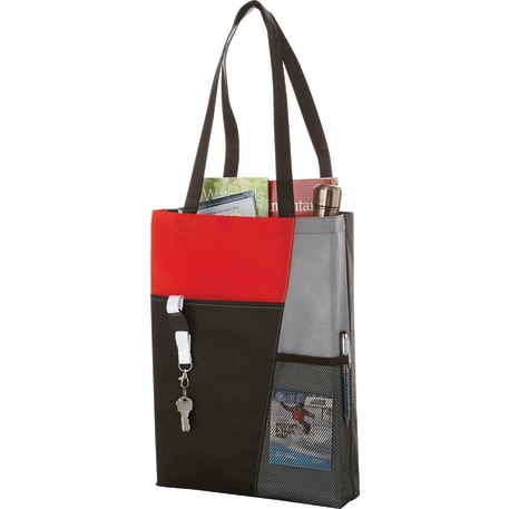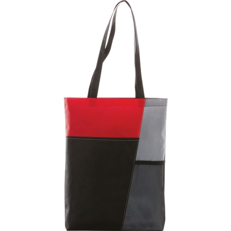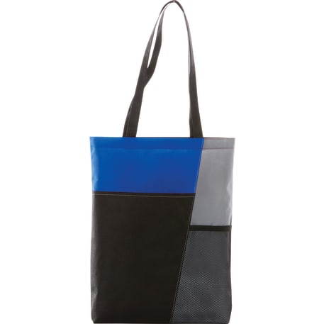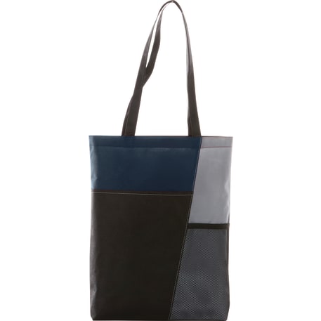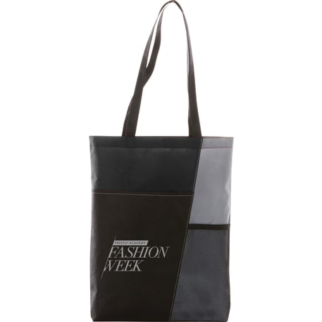 The Trip Non-Woven Convention Tote is ideal for trade shows and conventions and features an open main compartment, open front pocket and a mesh water bottle pocket and 13 inch drop handles. Polypropylene is recyclable with #5 plastics please check with your local municipalities for specific rules and regulations.