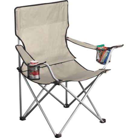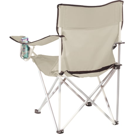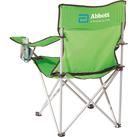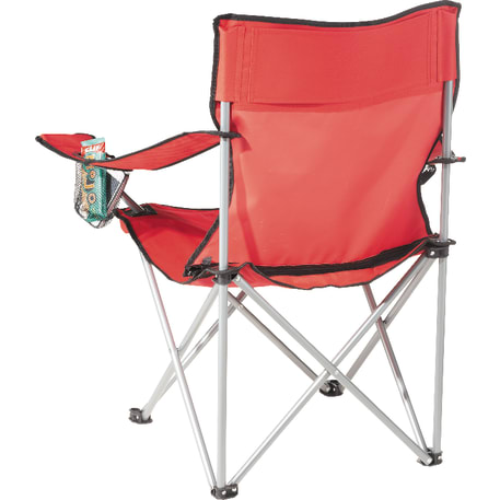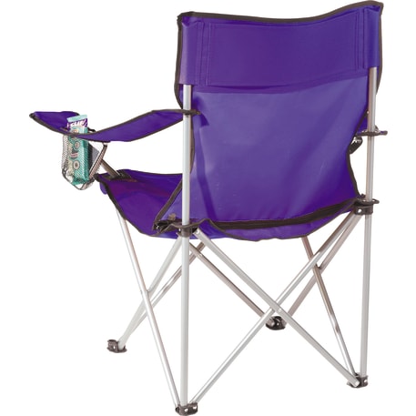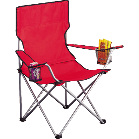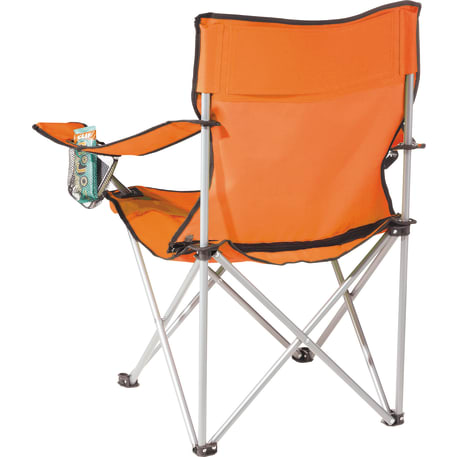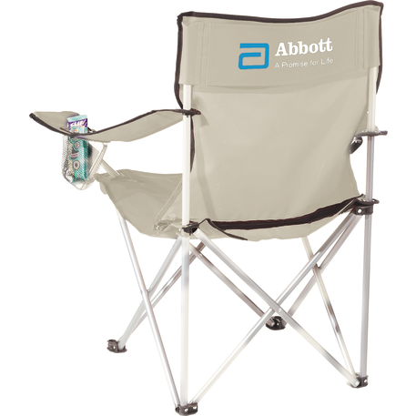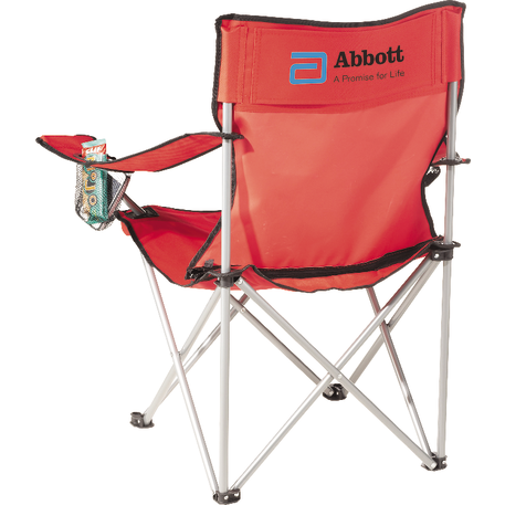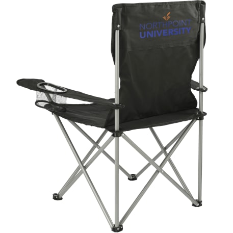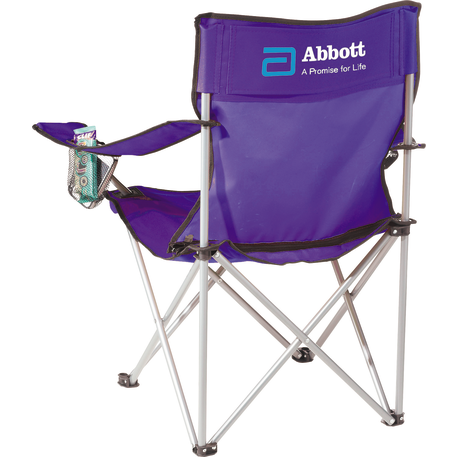 The Fanatic Event Folding Chair is a portable folding chair with an arm rest and built-in cup holders. Includes matching carry case with shoulder strap. This chair has a loading weight limit of 300 lbs. An imprint is available only on back of chair. Carry case not available for imprint.
