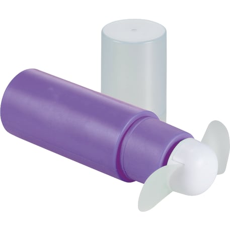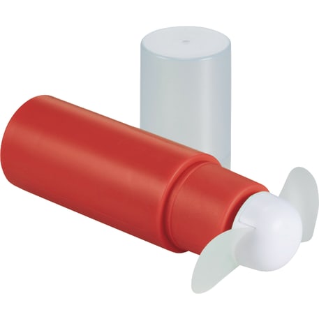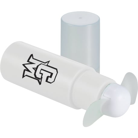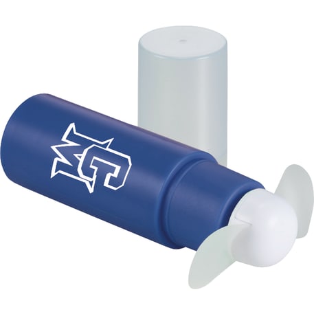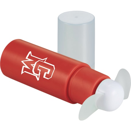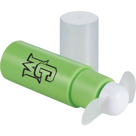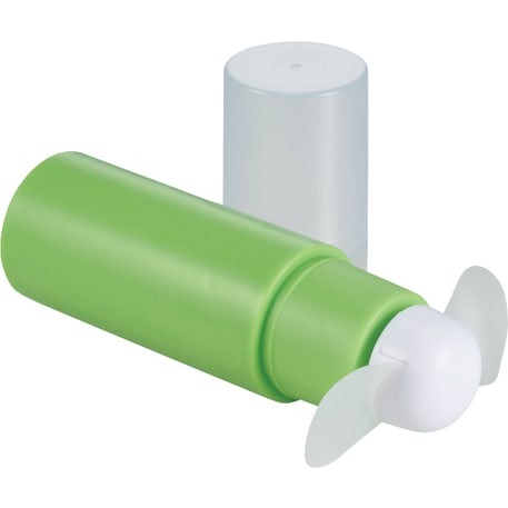 The Breeze Mini Fan with Cap is a plastic fan with a removable cap. Slide the switch to turn the power on/off.