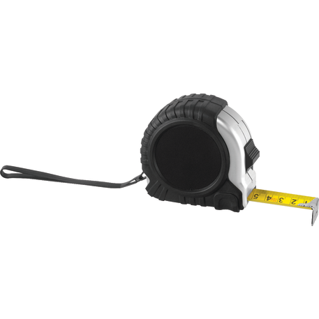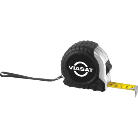 The Pro Locking Tape Measure includes a 25-foot retractable tape measure with standard and metric measurements, a rubber casing, a rubberized wrist strap and a metal belt clip. The slide locking button locks the tape in place.