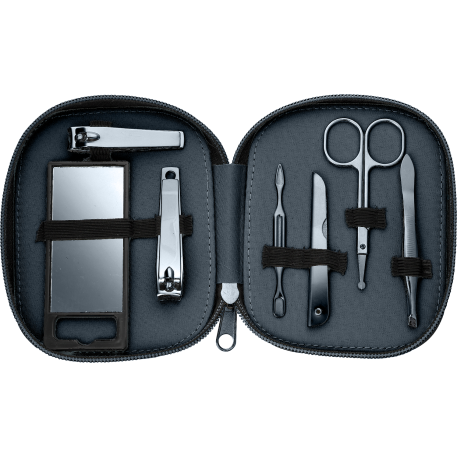 The Vanity 7-Piece Personal Care Kit is a zippered case with an open top pocket on front cover. Includes a personal mirror, fingernail clipper, toenail clipper, cuticle tool, nail file, scissors and tweezers.