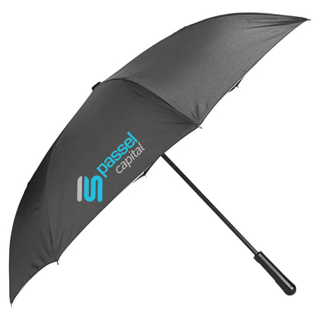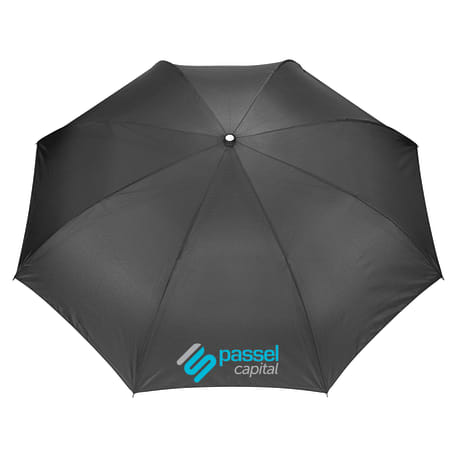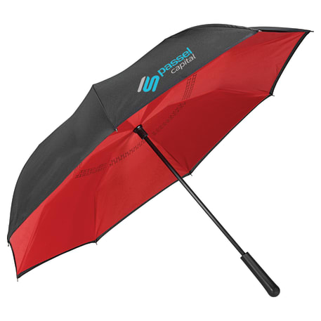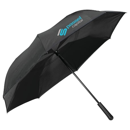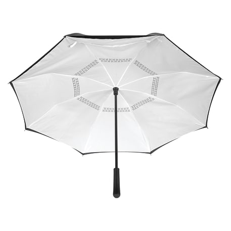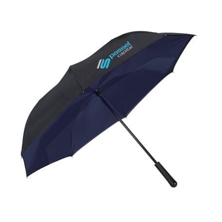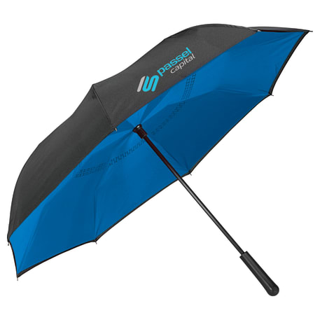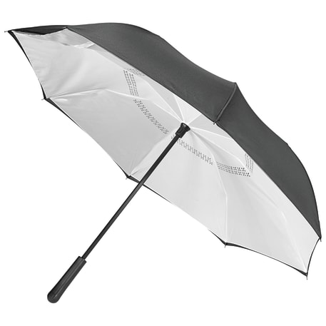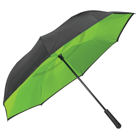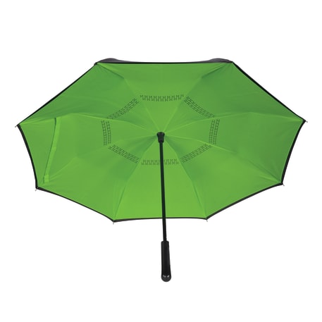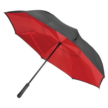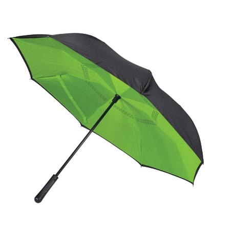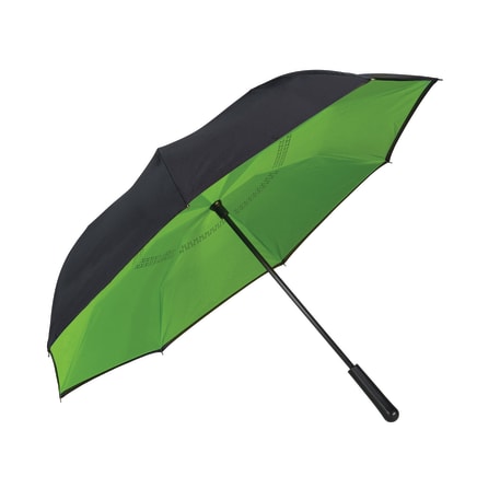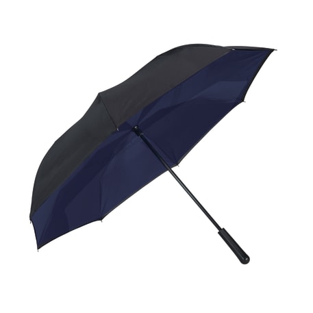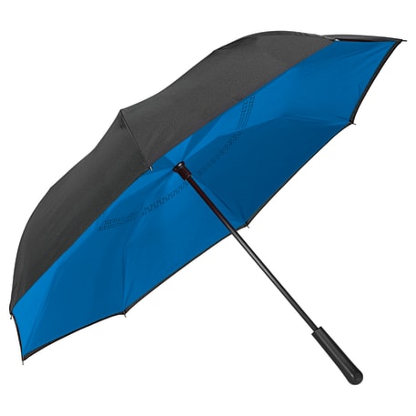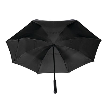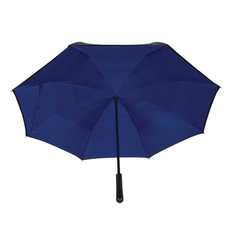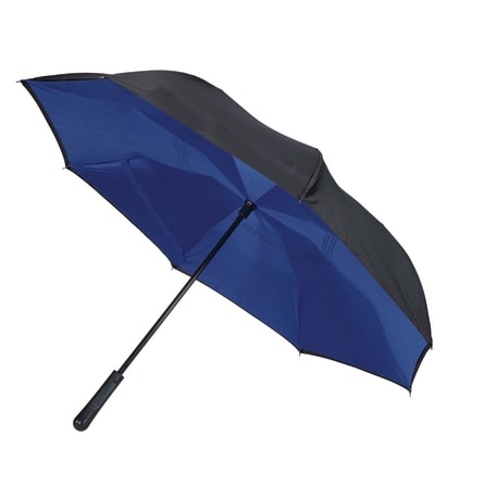 Innovative inverted folding design: opens and closes "inside-out" making it easier to use when entering and exiting a vehicle and keeping the water contained and outer surfaces dry. The umbrella can stand on its own when closed allowing the water to drain out to dry. Manual opening with push button pinch-proof runner. Dual layer polyester canopy. Available for one-day turn with Sureship®.