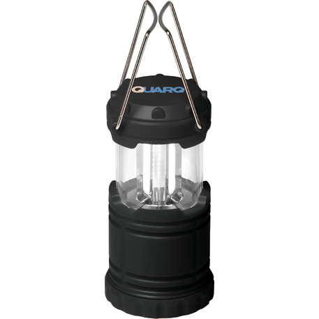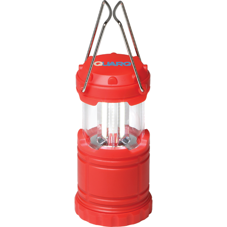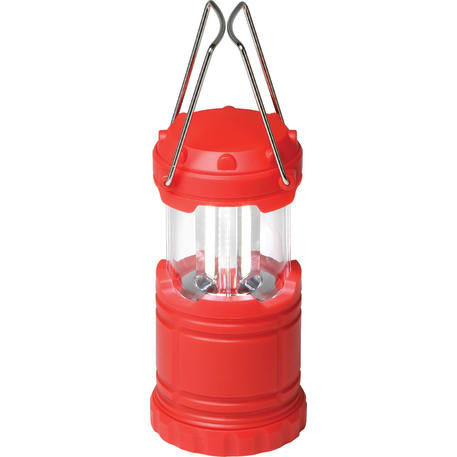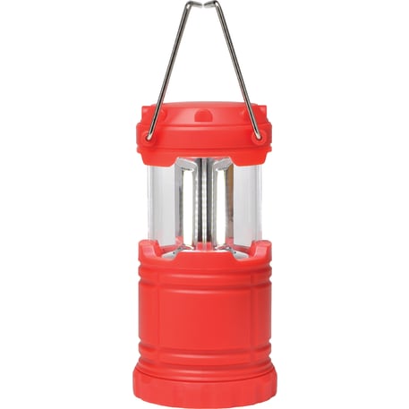 COB lantern turns on by sliding open and turns off by closing. Features metal carry and hanging handle. 5.5" fully extended. Includes 3 AAA batteries.