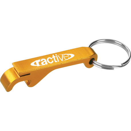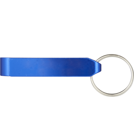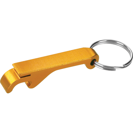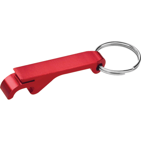 The Aluminum Bottle/Can Opener opens both bottles and flip-top cans and includes a metal split key ring.