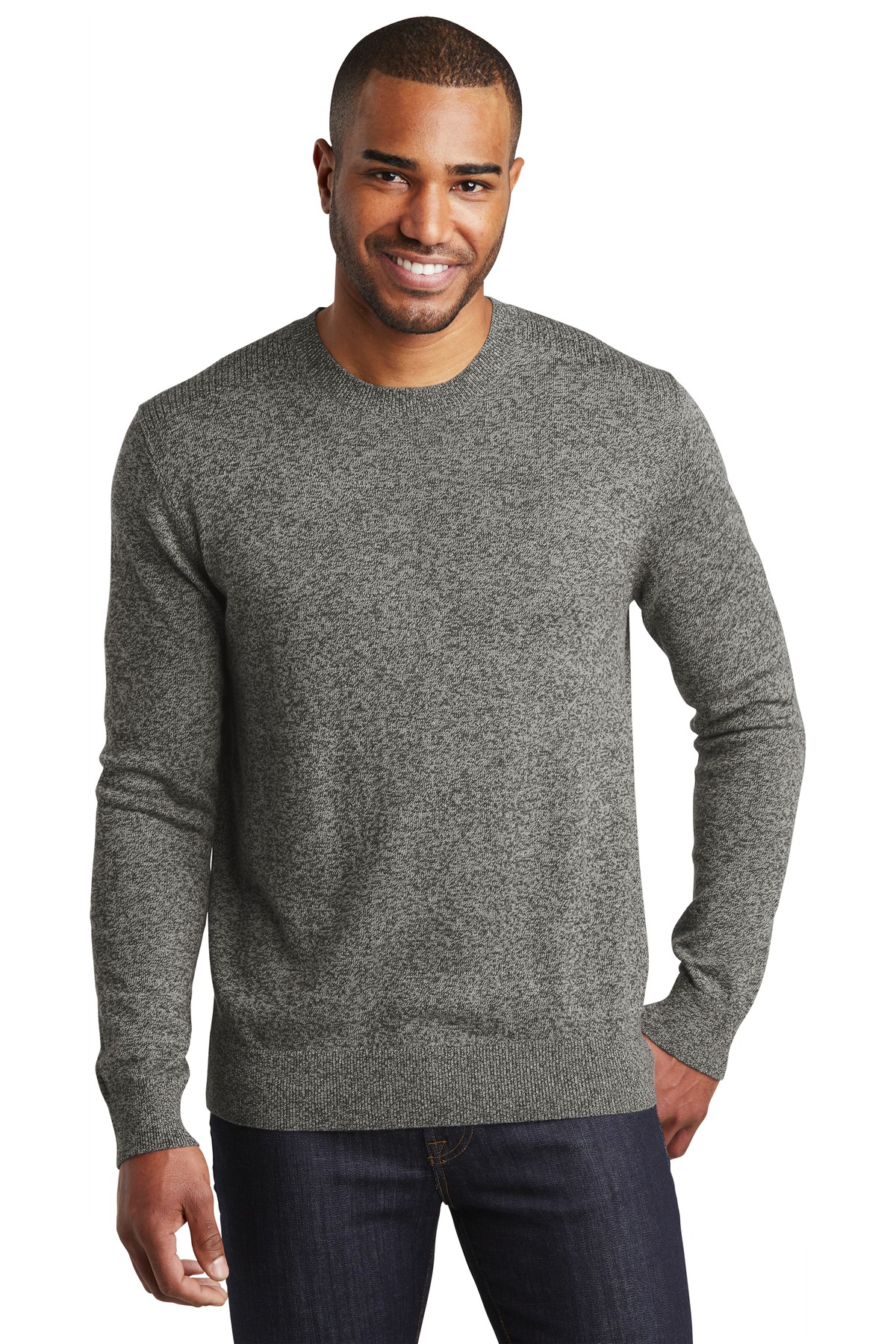 Two-toned marled yarns give this warm sweater a handsome look. 60/40 cotton/acrylic Fully fashioned seams Saddle shoulders with back-to-front rib detail 1x1 rib knit neck cuffs and hem