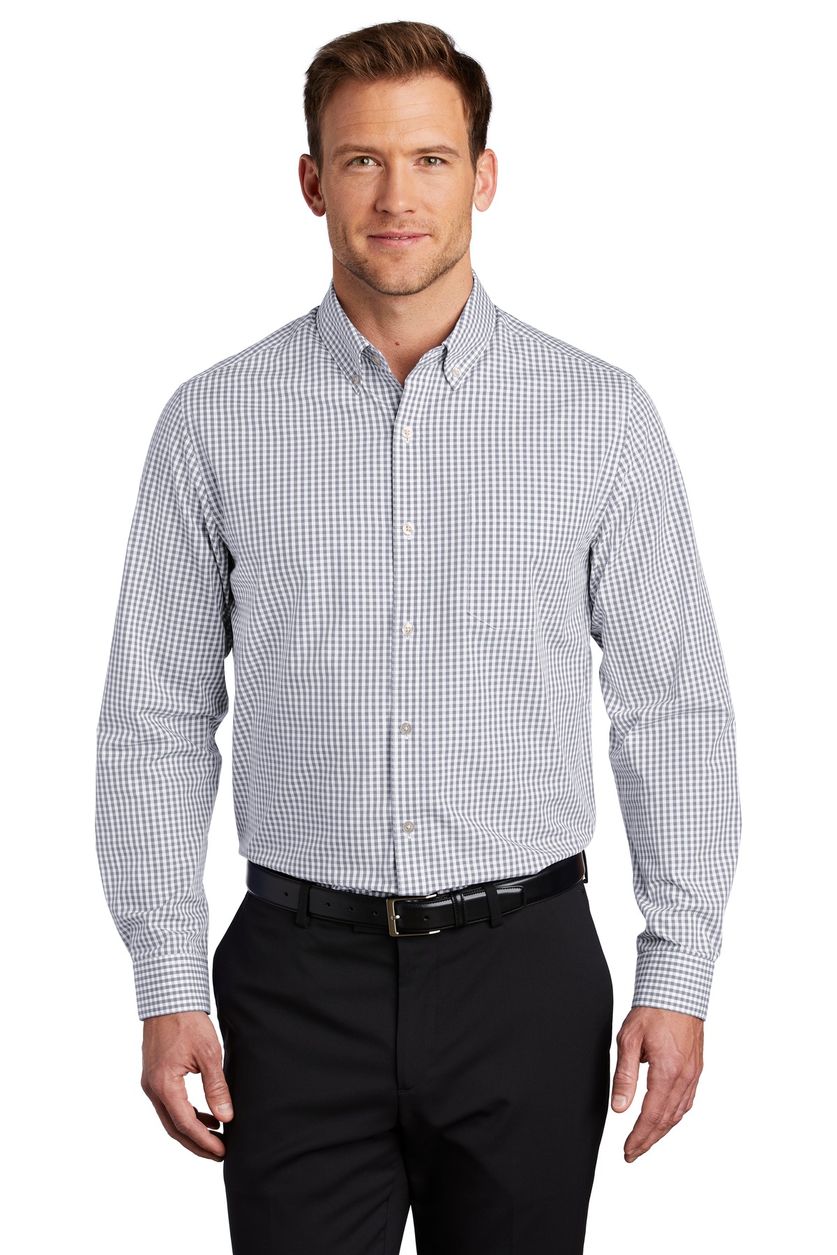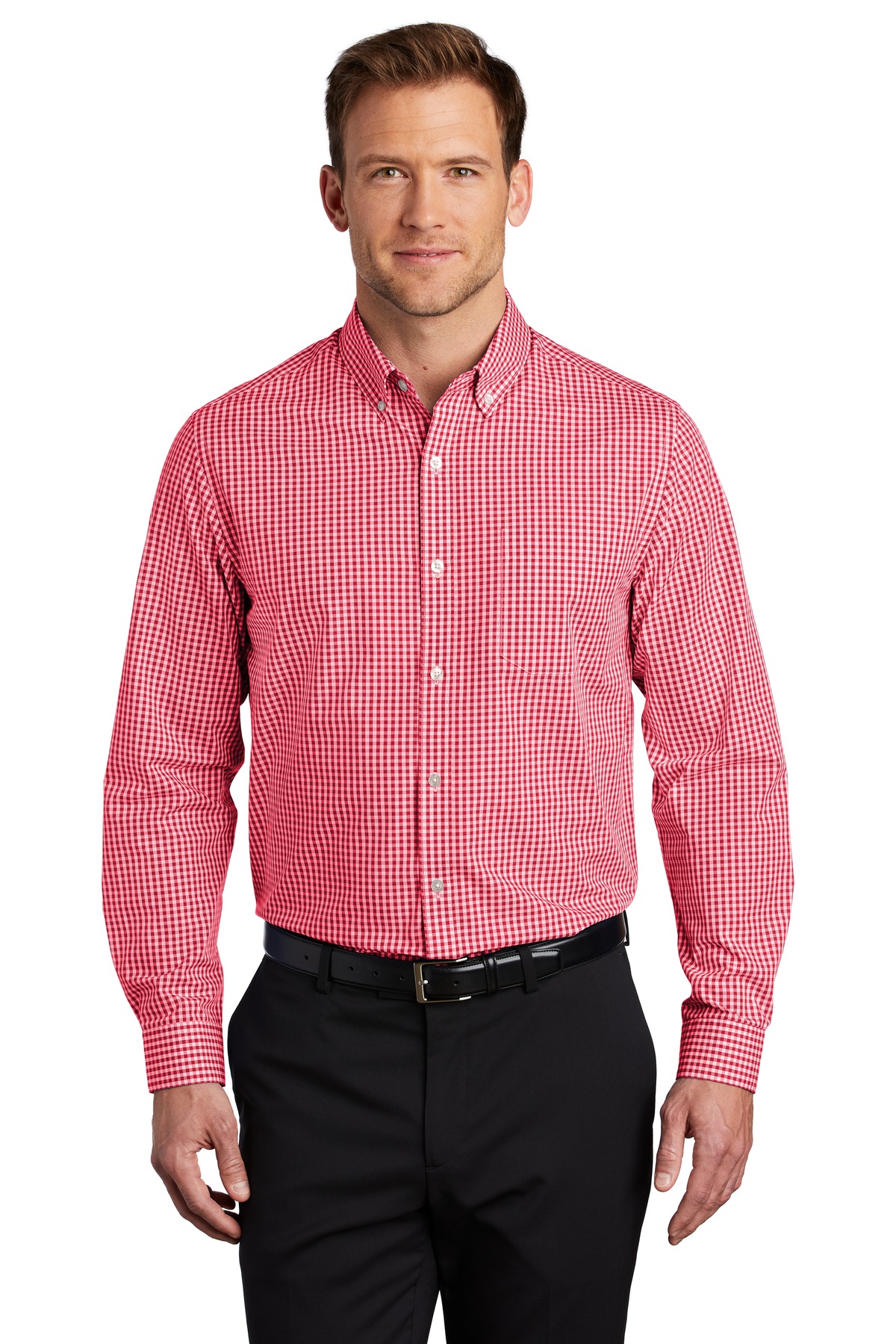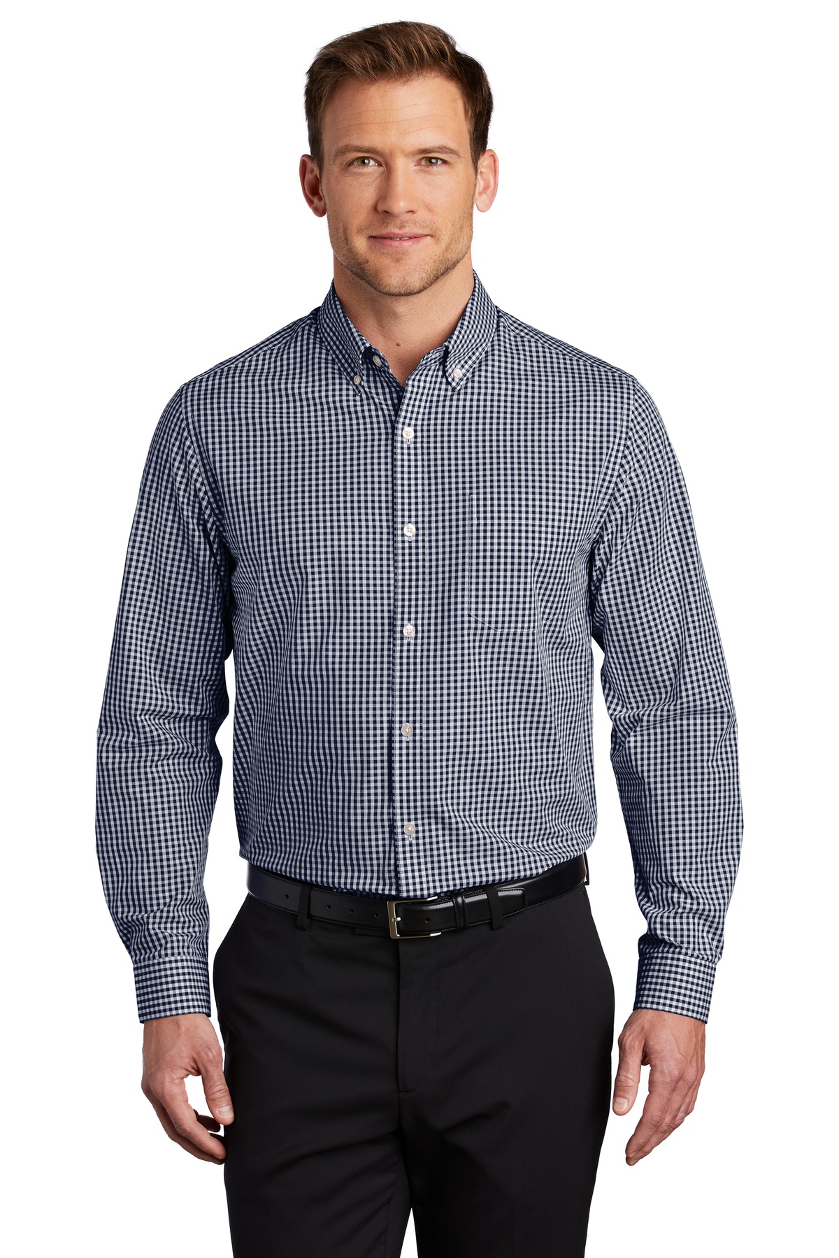 Banish boring office attire! Created with traditional gingham colors and scale our wrinkle-resistant shirts offer Easy Care convenience and everyday wearability. 3.1-ounce 60/40 cotton/poly Bias-cut details Button-down collar Pearlized buttons Back box pleat Left chest pocket Mitered adjustable cuffs