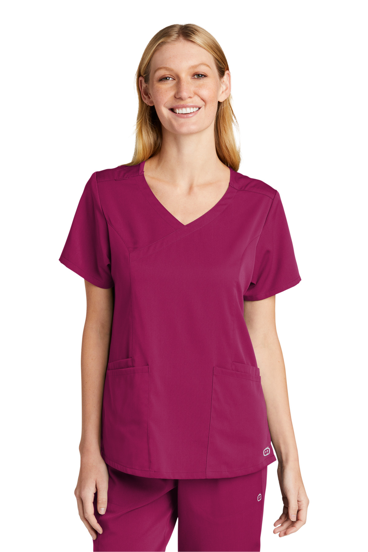 78/20/2 poly/rayon/spandex Wrap top necklineFront princess seams Shoulder badge loopTop-loading front pockets with interior pockets and pen slot Side vents WonderWink heat transfer logo at left pocket Modern fit