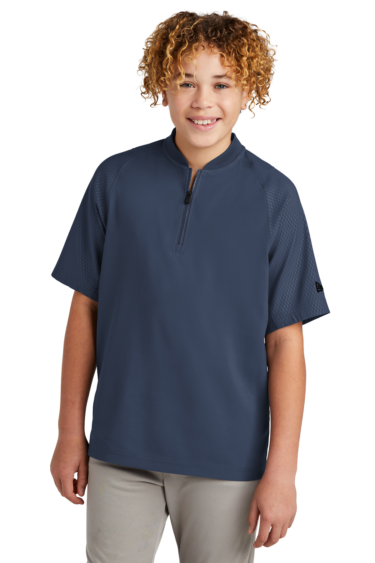 Designed for warm-ups and batting practice-or for fun at the batting cages-this water-repellent wind-resistant jacket has short sleeves for ease of movement. 94/6 poly/spandex with durable water-repellent (DWR) finish Heat transfer label for tag-free comfort Rib knit neck Embossed New Era neck taping Locker loop Raglan sleeves embossed with subtle Diamond Era pattern Vislon zipper with easy-grip textured New Era zipper pull Silicone New Era flag logo on left sleeve Drop tail hem